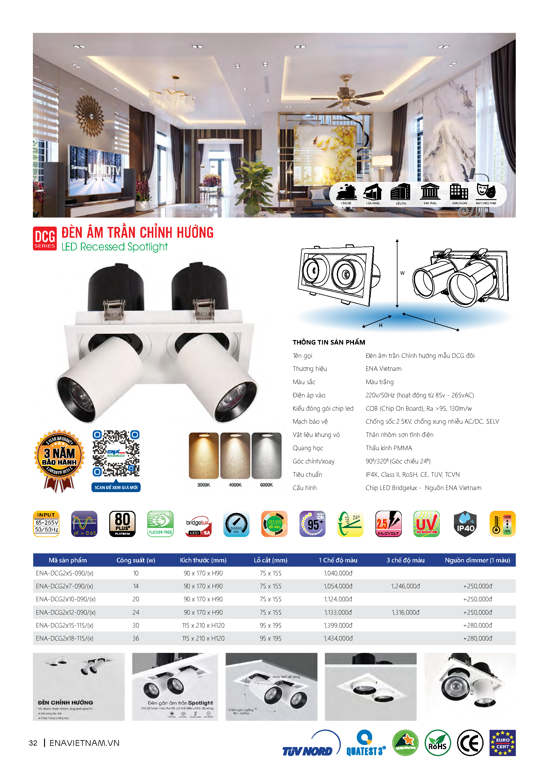 Đèn âm trần đôi chỉnh hướng chiếu điểm ENA vietnam bảo hành 3 năm Công suất: 5W2, 7W2, 10W2, 12W2 +Kích thước: 90x170xH90mm