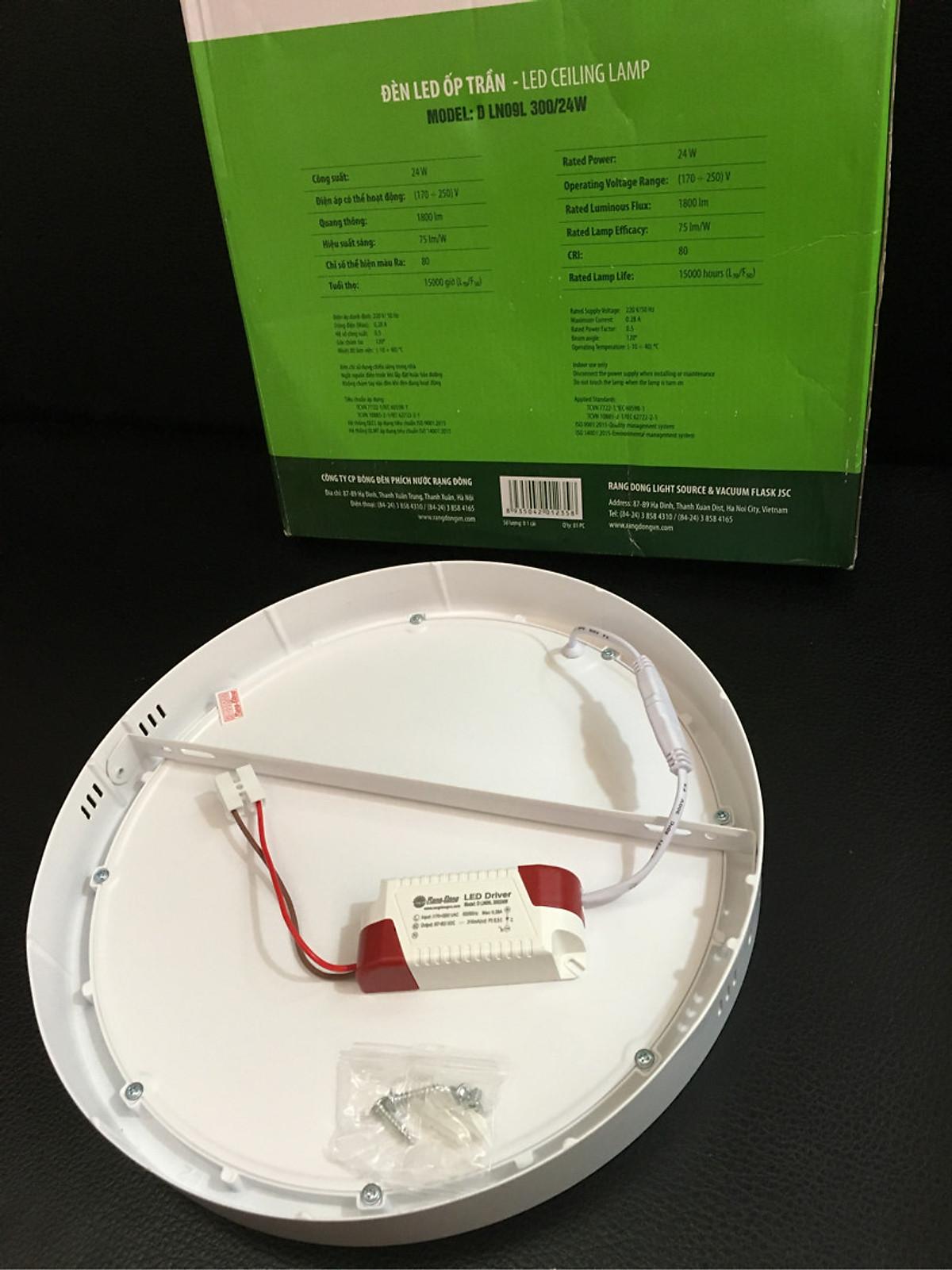 Shop thương hiệu Rạng Đông uy tín, tin cậy Model: LN12N ĐM 300/24W Điện áp: 220 V/50 Hz Nhiệt độ màu: 6500K/4000K/3000K Quang thông: 2000 lm/2000lm/1800lm Kích thước (ØxH): (300x36)mm Tuổi thọ 25000h Chỉ số
