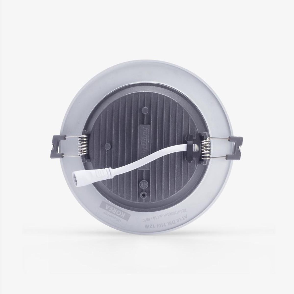 Đèn LED Âm trần Downlight Đổi màu 12W Model: AT10 ĐM 110/12W Công suất: 12W Điện áp hoạt động: 220V/50Hz Quang thông: 1200lm Đổi 3 màu: 6500K/3000K/4000K Kích thước (ØxH): (138x36)mm ĐK lỗ khoét trần: 110mm Sử dụng Chip LED Hàn Quốc đạt độ tin cậy cao Chất lượng ánh sáng cao (CRI> 80) tăng khả năng nhận diện màu sắc của vật được chiếu sáng Dải điện áp rộng 150 – 250V đáp ứng dải điện áp lưới tại Việt Nam. Thân vỏ chất liệu nhôm thuần được phủ lớp sơn nano cho màu sắc tương đồng với màu sắc hệ trần thạch cao, trần nhôm.