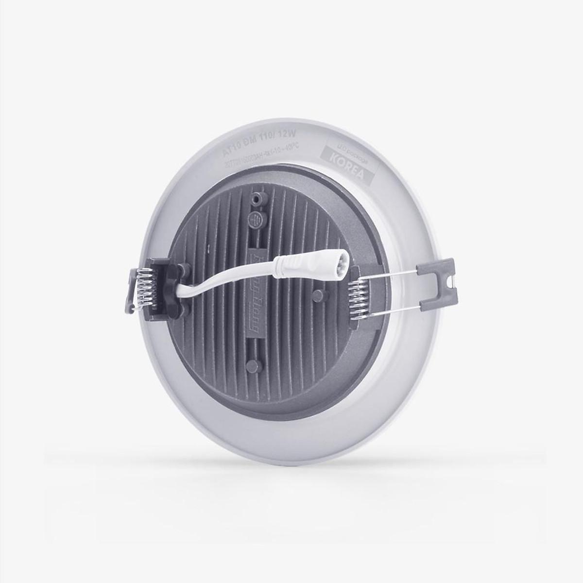 Đường kính khoét lỗ / Công suất: 110/12W. Dải điện áp hoạt động: (150V - 250V)/50Hz Quang thông: 930lm/910lm Nhiệt độ màu: Sáng trắng 6500K/ Sáng vàng 3000K Kích thước (ØxH): (138x50)mm ĐK lỗ khoét
