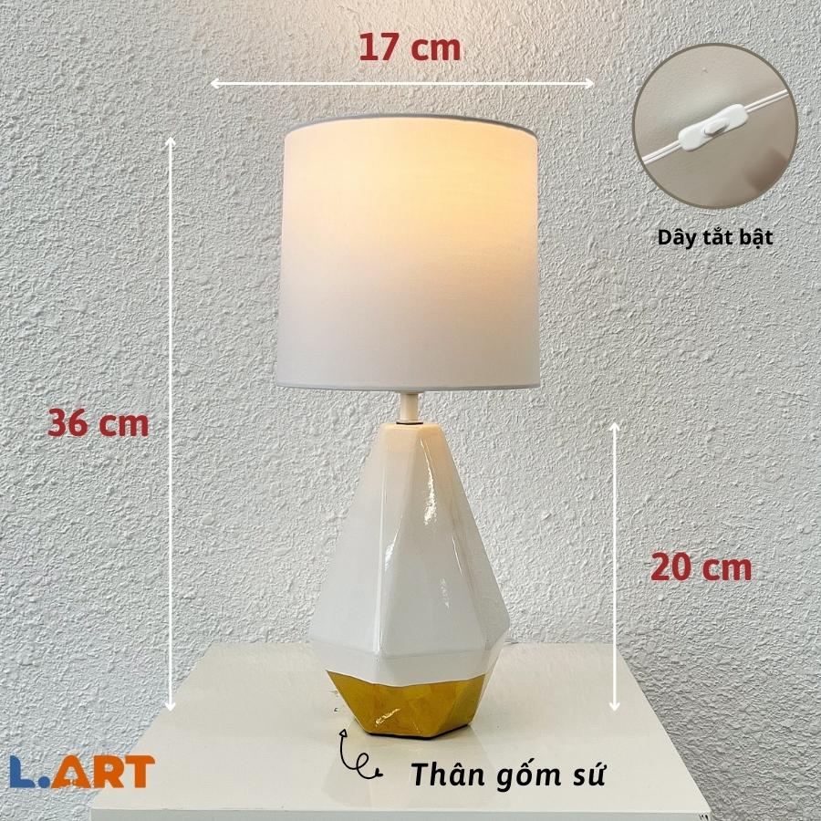 ️ Chất liệu: Chao đèn bằng vải trụ + Thân đèn bằng gốm sứ. ️ Đui đen: dạng xoáy E27 ️ Kích thước:( chiều dài thân x đường kính chao đèn x chiều cao tổng): 23 x 17 x 40 (cm) ️ Thông số bóng: Bóng đèn Led max 3W ánh sáng 3000K đui E27 ️ Loại công tắc: công tắc tắt-bật ->> Sản phẩm không có sẵn bóng đèn, L.art tặng kèm 1 bóng đèn ánh sáng vàng trung tính cho khách hàng những trải nghiệm tốt nhất và sản phẩm. Bảo hành: Chính sách 1 đổi 1 cho sản phẩm trong vòng 7 ngày tính từ ngày khách nhận được sản phẩm và gặp vấn đề về dây đèn. Các vấn đề khác vui lòng nhắn tin để shop tư vấn ạ ^^ → Lưu ý: Hàng phải giữ nguyên sản phẩm bao gồm cả ni lông bọc đèn và hộp đựng. Đèn được đóng gói thùng xốp cẩn thận để đảm bảo đèn và chụp đèn bạn nhận được 100% hoàn hảo như hình