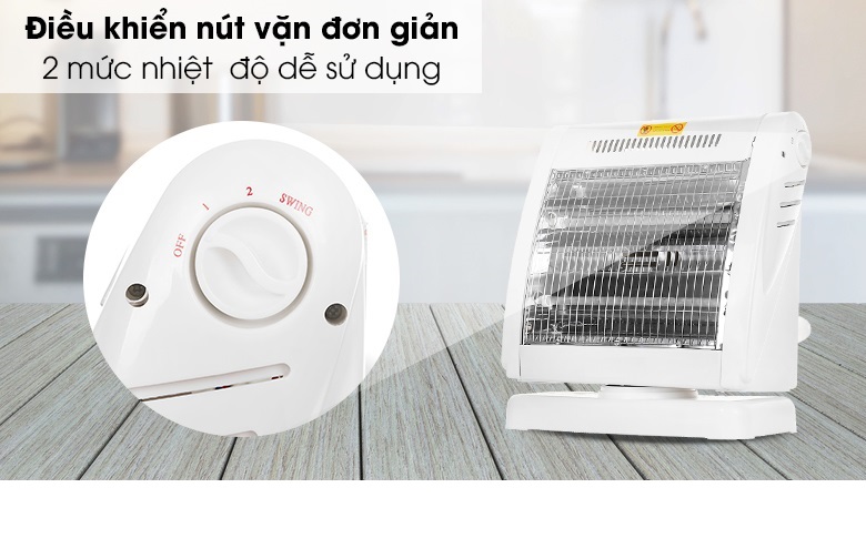 - Tự động ngắt điện khi quạt bị nghiêng hay đổ Đèn Sưởi Điện 2 Bóng Halogen 800W Xoay 90 Độ - Hàng Chính Hãng là một trong những thiết bị sưởi ấm không thể thiếu tại gia đình trong mùa đông. Sản phẩm sử dụng đèn Halogen, tỏa nhiệt đều, làm ấm nhanh, không gây khó thở và khô da, đảm bảo an toàn cho người sử dụng. Kiểu dáng sang trọng, hiện đại Đèn Sưởi Điện 2 Bóng Halogen 800W Xoay 90 Độ - Hàng Chính Hãng có thiết kế sang trọng hơn, kiểu dáng hiện đại và bắt mắt, nhỏ gọn tiết kiệm diện tích và phù hợp mọi không gian như phòng khách, phòng ngủ, Điều khiển dễ dàng bằng nút xoay Đèn Sưởi Điện 2 Bóng Halogen 800W Xoay 90 Độ - Hàng Chính Hãng có 3 mức công suất 400W, 800W điều chỉnh bằng núm vặn linh hoạt theo 2 chiều giúp bạn dễ dàng lựa chọn được mức nhiệt phù hợp với môi trường và nhu cầu sử dụng. Chắc chắn, bền đẹp, an toàn Đèn Sưởi Điện 2 Bóng Halogen 800W Xoay 90 Độ - Hàng Chính Hãng có chân đế vững chãi, lưới bảo vệ, tránh gây bỏng cho người dùng. Đặc biệt, lồng và vỏ nhựa phía sau chống cháy tuyệt đối, lưới tản nhiệt giúp sản phẩm không bị hư hỏng do quá nóng. TỎA NHIỆT ĐỀU, KHÔNG GÂY KHÔ DA Làm ấm cực nhanh, không gây khô da Đèn Sưởi Điện 2 Bóng Halogen 800W Xoay 90 Độ - Hàng Chính Hãng sử dụng đèn halogen, làm ấm cực nhanh, độ bền vượt trội, chống chói mắt hiệu quả và không đốt cháy oxy nên không gây khó thở hay khô da khi dùng. Quay đảo chiều, tỏa nhiệt đều khắp phòng Sản phẩm có khả năng quay đảo chiều liên tục, giúp tỏa nhiệt đều khắp phòng, rất thích hợp khi sử dụng tại không gian rộng như phòng khách hoặc phòng có nhiều người. An toàn với người sử dụng Đèn Sưởi Điện 2 Bóng Halogen 800W Xoay 90 Độ - Hàng Chính Hãng có chế độ tự động ngắt điện khi bị nghiêng đổ và hoạt động trở lại bình thường trở lại trạng thái an toàn. Thông số kỹ thuật