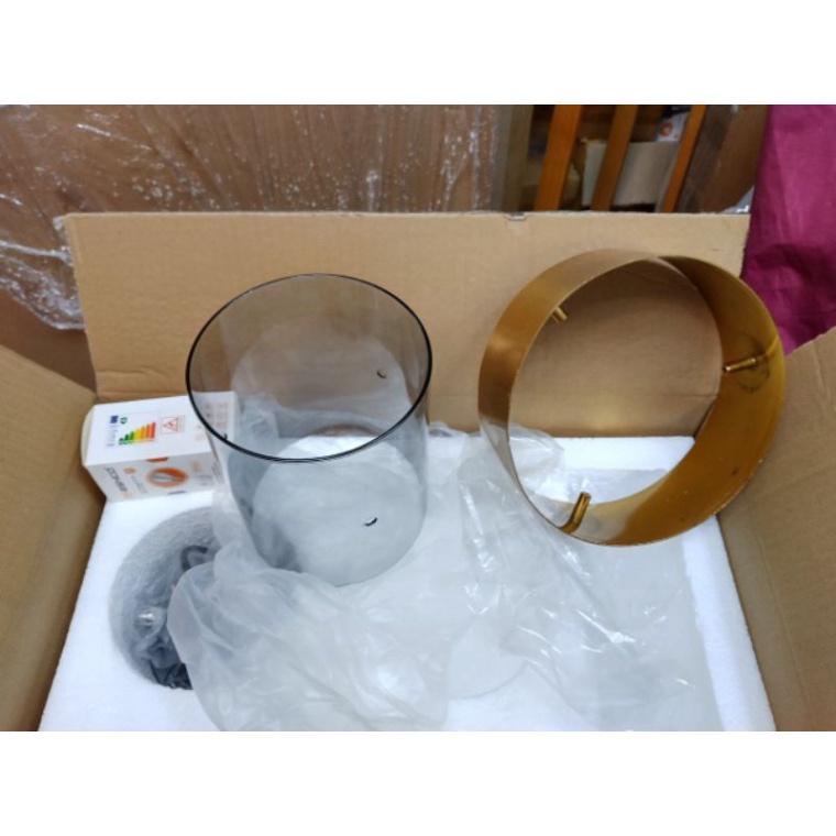 Mô tả sản phẩm Chất liệu: Đế bằng inox mạ vàng,chao là thủy tinh trong màu khói, viền kim tông màu vàng Đui e 27. Số lượng: 01 cái