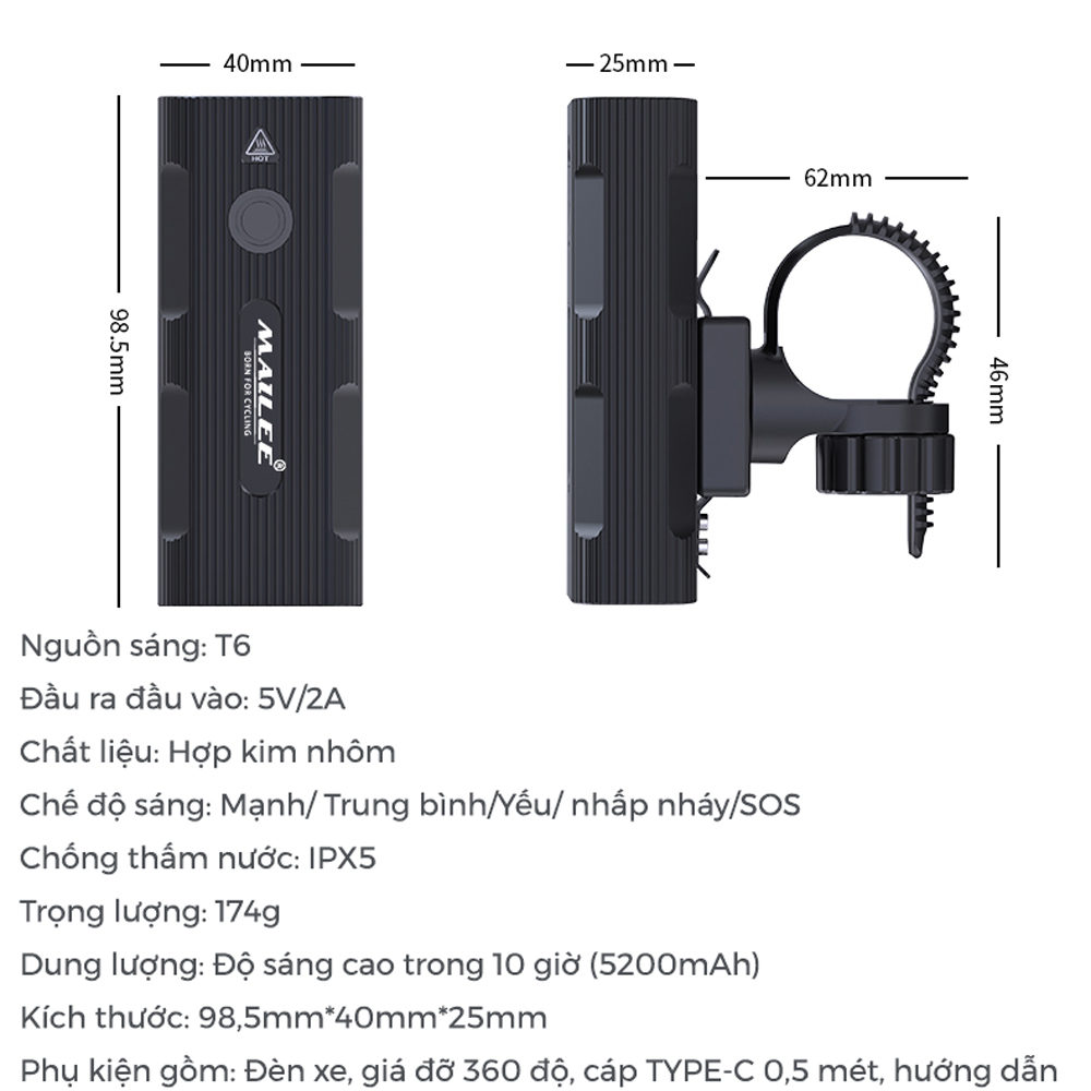 - Phụ kiện đi kèm: Đèn xe đạp, giá đỡ, dây TYPE-C, hướng dẫn sử dụng