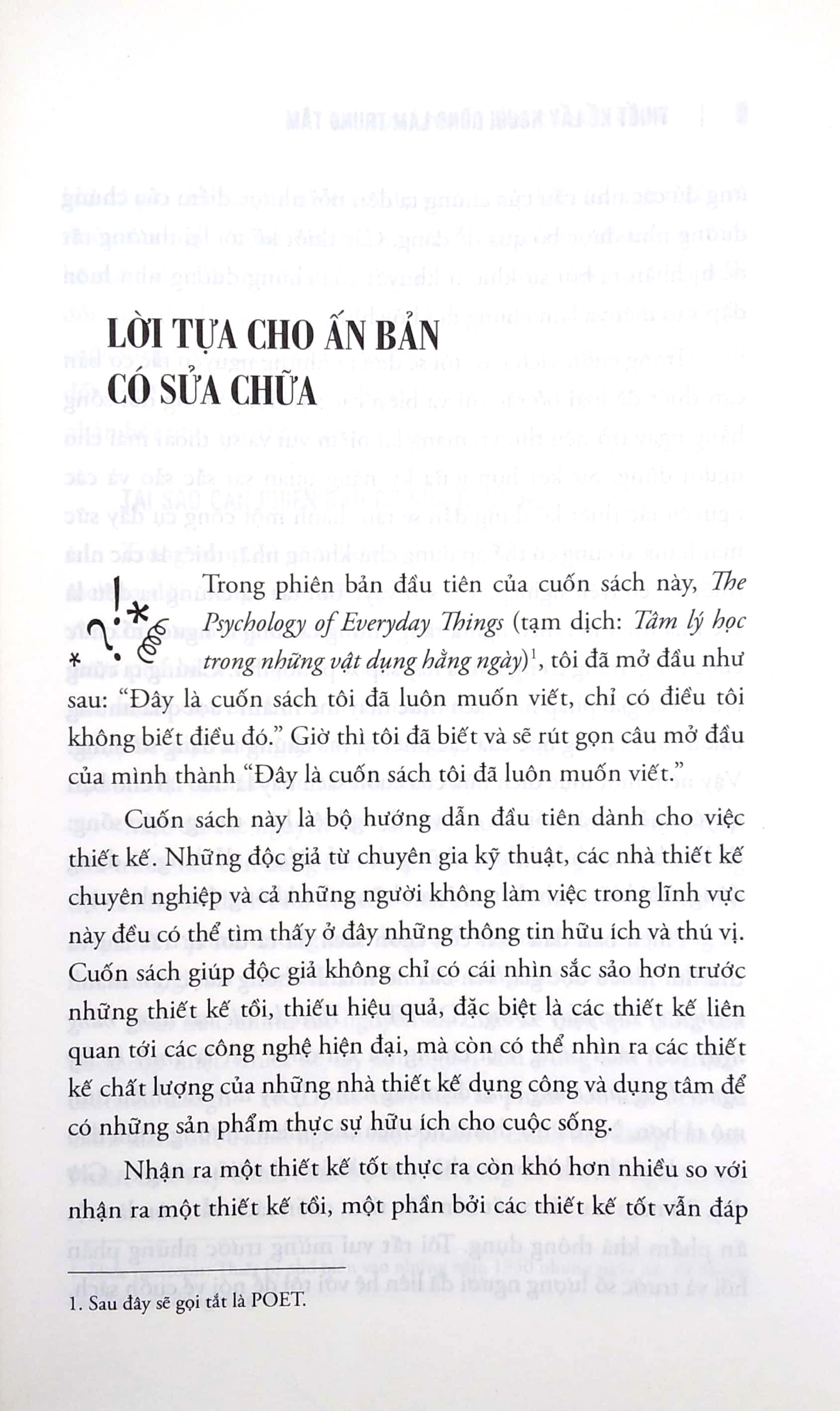 Cuốn sách giúp độc giả trở thành các nhà quan sát sắc sảo trước những thiết kế kém cỏi và ngớ ngẩn đang gây ra rắc rối cho cuộc sống của con người, đặc biệt là những sản phẩm liên quan tới công nghệ hiện đại. Don Norman sẽ khiến bạn phải gật gù tâm đắc khi phân tích thiết kế của các vật dụng thường ngày, từ bồn rửa tay, cánh cửa, ghế ngồi cho tới điện thoại hay giao diện phần mềm. Không chỉ vậy, Norman còn chỉ ra các nguyên tắc dựa trên tâm lý học nhận thức để thiết kế mọi thứ đúng đắn, khoa học. Bộ đôi này đã trở thành công cụ đầy sức mạnh để khiến cuộc sống của chúng ta trở nên thú vị, thoải mái và nhiều niềm vui hơn.