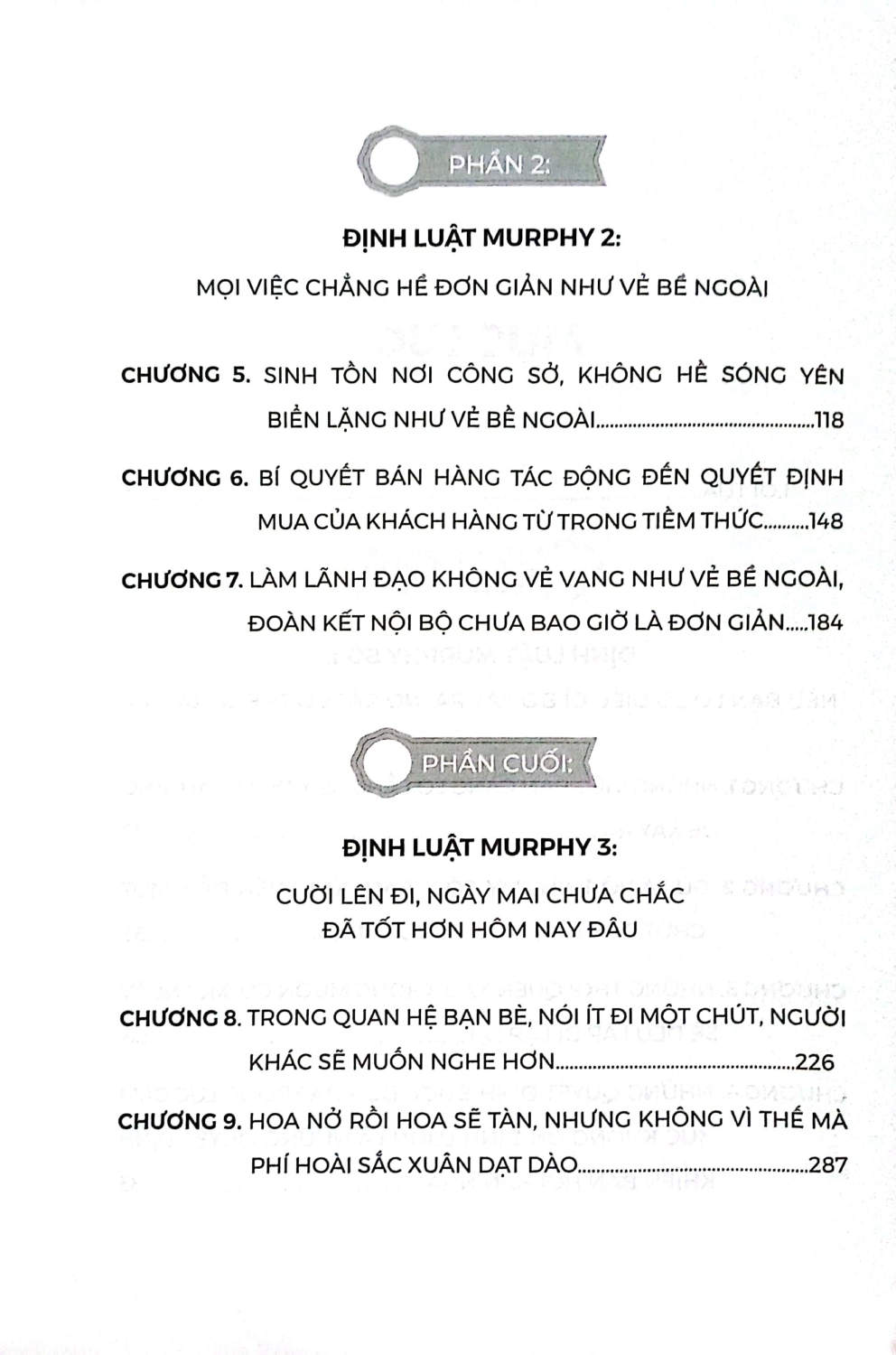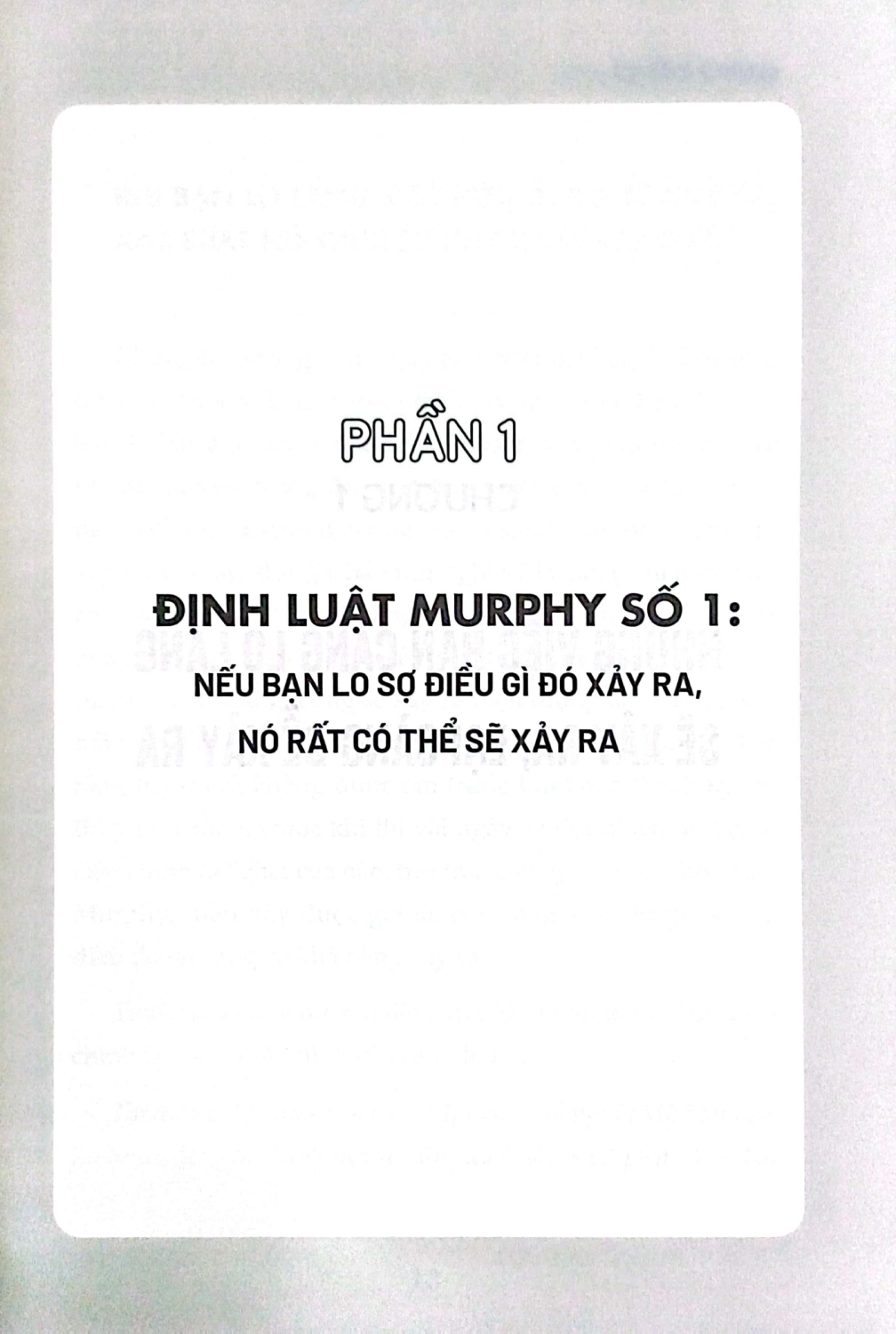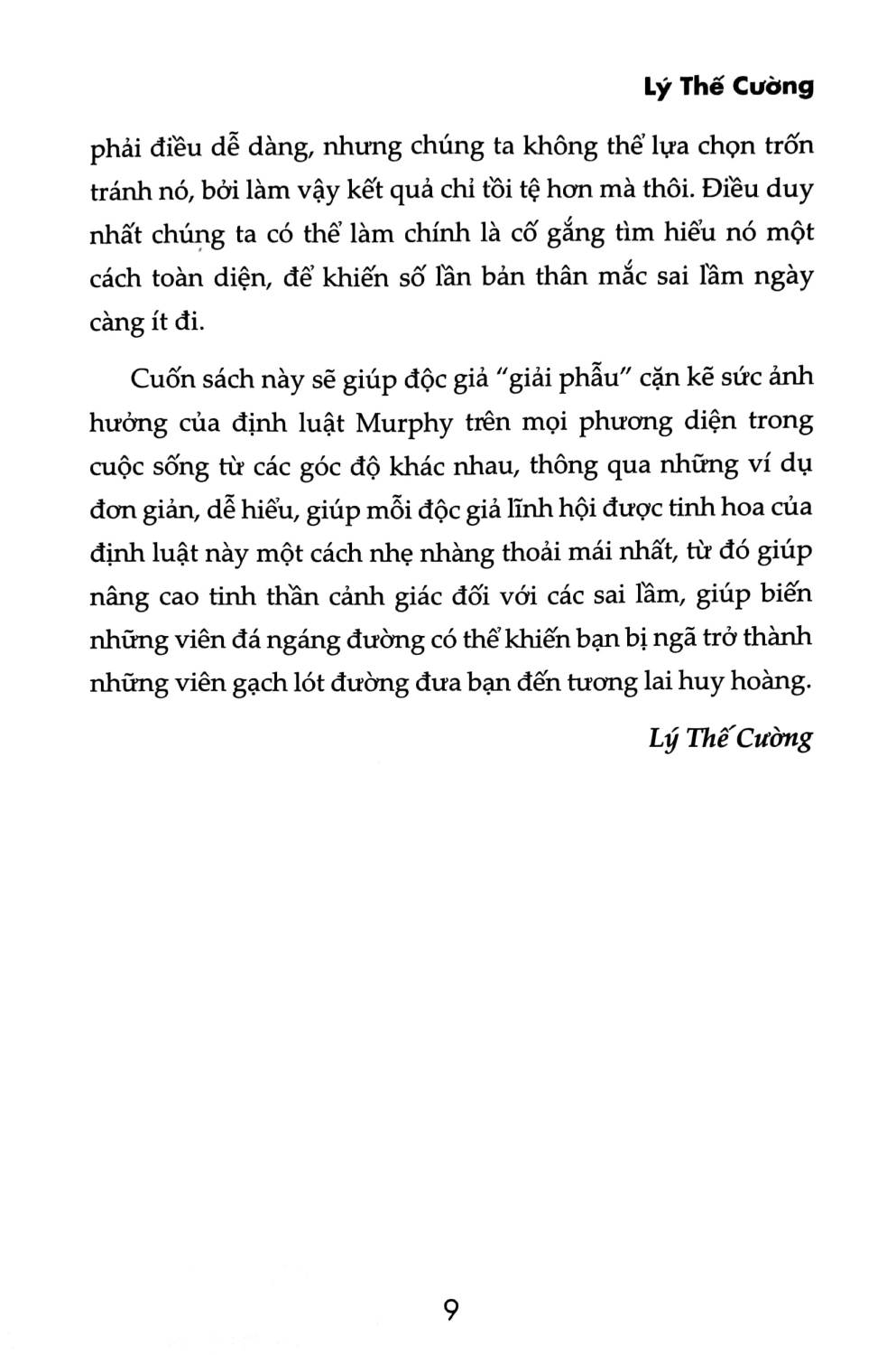 Cuốn sách Định Luật Murphy - Làm Sao Để Những Việc Bạn Lo Lắng Sẽ Không Xảy Ra của tác giả Lý Thế Cường, sẽ giúp chúng ta “giải phẫu” cặn kẽ sức ảnh hưởng mạnh mẽ của định luật Murphy trên mọi phương diện trong đời sống – xã hội, từ các góc độ khác nhau, thông qua những ví dụ đơn giản, dễ hiểu, giúp mỗi độc giả lĩnh hội được tinh hoa của định luật này một cách nhẹ nhàng thoải mái nhất, từ đó giúp nâng cao tinh thần cảnh giác đối với các sai lầm, giúp phá vỡ những tảng đá ngáng đường khiến con đường trở nên bằng phẳng, đưa bạn đến với tương lai tươi sáng hơn.
