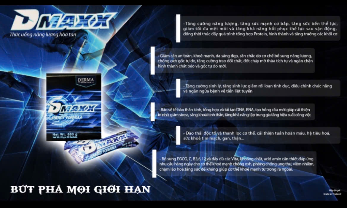 Dmaxx energy formula là sản phẩm thức uống năng lượng có chức năng bổ sung năng lượng cho người uống mỗi ngày dưới dạng thức uống hòa tan.