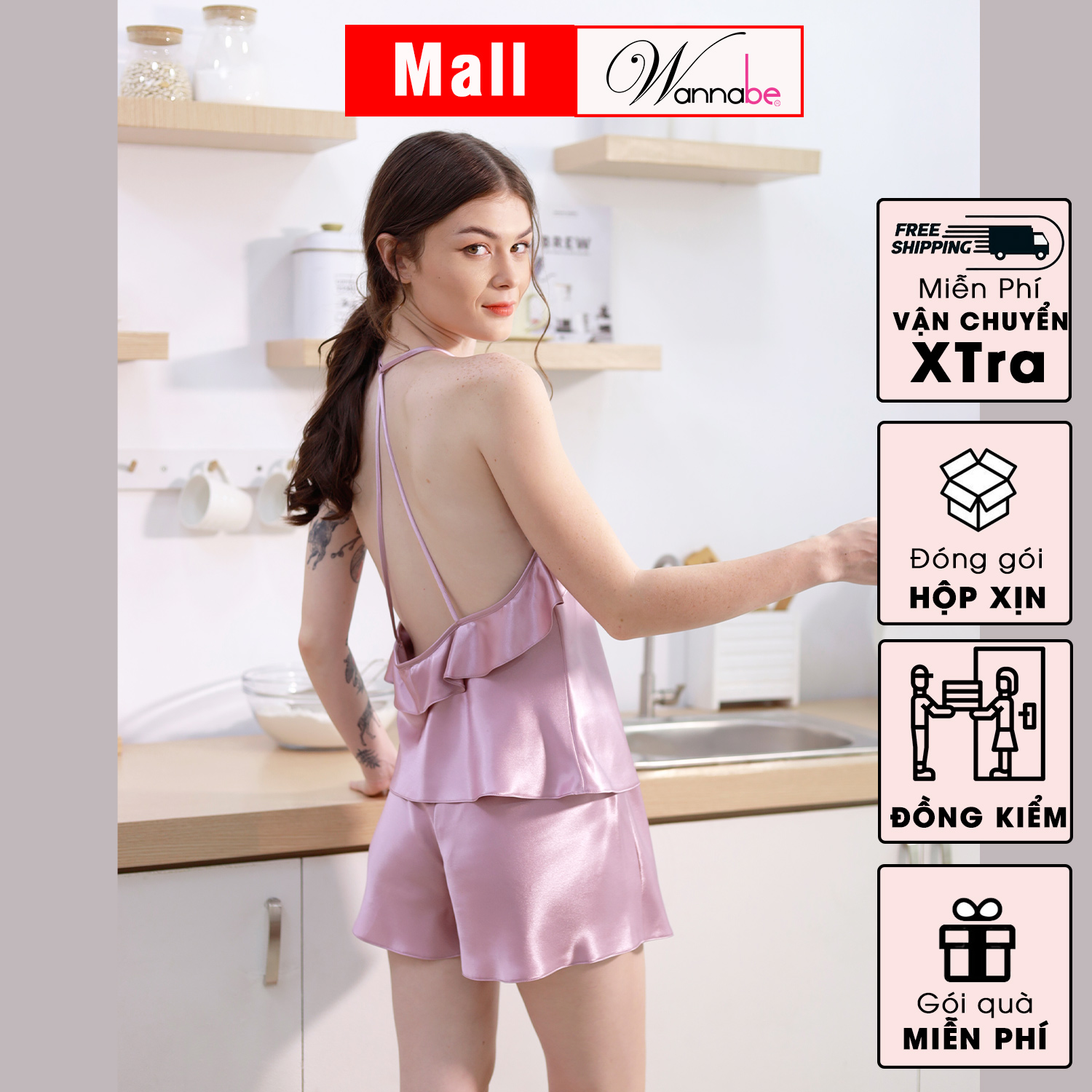Đồ bộ mặc nhà WANNABE BSS61 bộ sọt phối áo 2 dây cut-out phần lưng với dây trang trí cột hình thoi khoe lưng xinh đẹp Đồ bộ mặc nhà phi lụa cao cấp Wannabe