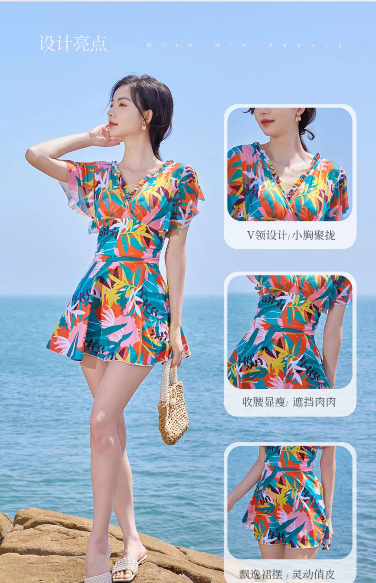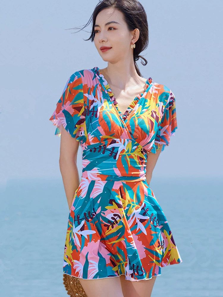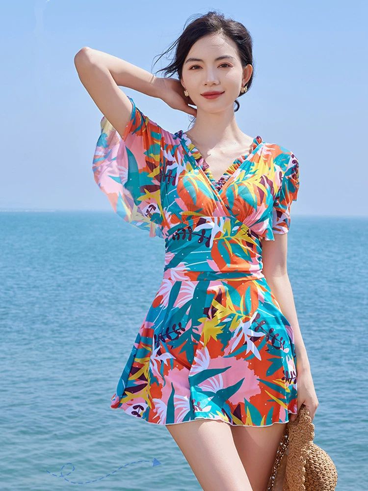KIỂU DÁNG Màu sắc: Hoa Đồ bơi một mảnh tay ngắn dạng váy kín đáo Kiểu dáng váy có khoá kéo tiện lợi Ngực áo có Mút Mỏng Đường may sản phẩm tỉ mỉ, tinh