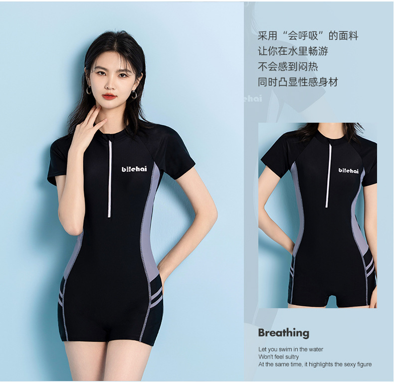 Đồ bơi một mảnh liền thân ngắn tay cho nữ màu đen, phối sọc xám phong cách thể thao, có mút, và lót áo bên trong Xuất xứ: Quảng Châu, TQ. Chất liệu : 82% polyester, 18 % Spandex. (vải thun co dãn 4 chiều) Kiểu dáng : liền thân tay ngắn, quần ngắn, dây kéo trước ngực. Đặc điểm: mặt trong thân trước áo bơi có lót toàn thân 2 lớp Phần lót ngực thì có thể tháo rời miếng lót. Size M: 40-48kg Size L: 48- 55kg Size XL: 55 - 60kg Size 2XL: 60 - 65kg