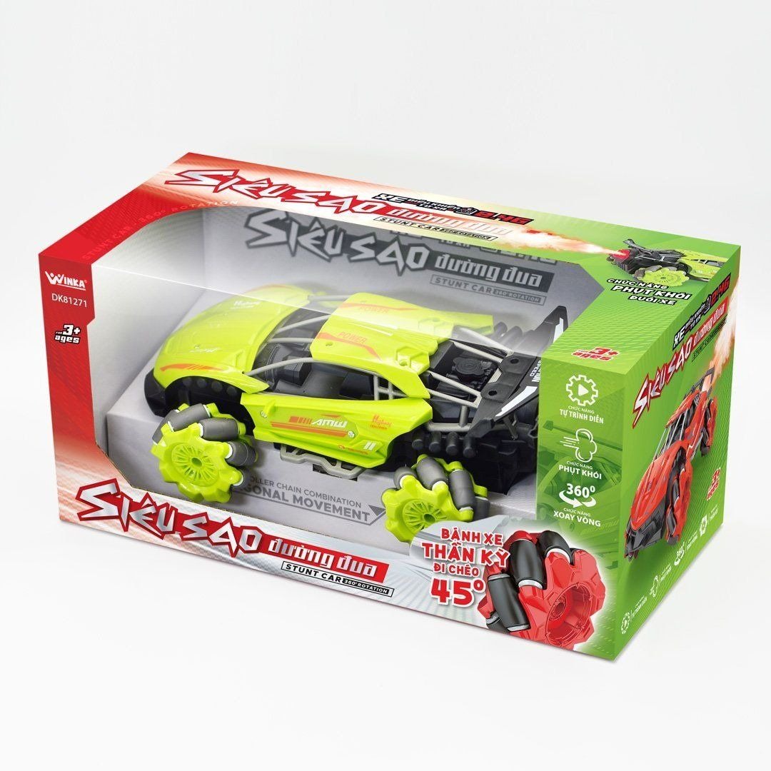 XE ĐIỀU KHIỂN TỪ XA 2.4G - KIỆN TƯỚNG NHÀO LỘN Đồ chơi xe điều khiển được thiết kế với mô hình xe đua, chất liệu hợp kim độ bền cao, lốp cao su to và