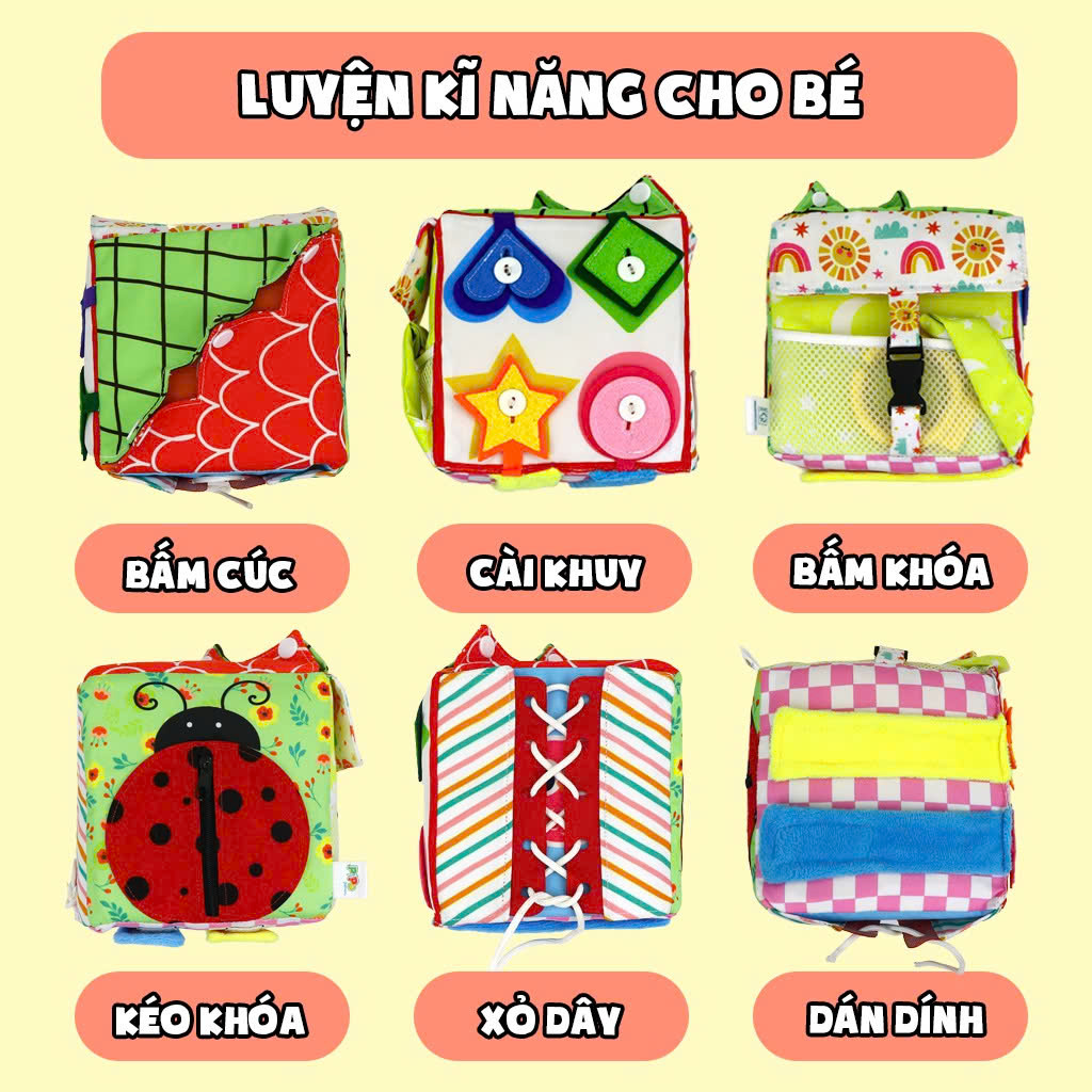 Đồ Chơi Khối Vải Luyện Kỹ Năng Kiêm Lục Lạc Cho Bé - PiPoVietnam Đồ chơi cho bé PiPoVietnam - Khối vải luyện kỹ năng cho bé, đồ chơi thông minh, an toàn HƯỚNG DẪN SỬ DỤNG VÀ CHI TIẾT SẢN PHẨM ĐỒ CHƠI CHO BÉ: Khối vải luyện kỹ năng cho bé có 6 mặt mô phỏng cho 6 việc tương tự trong cuộc sống