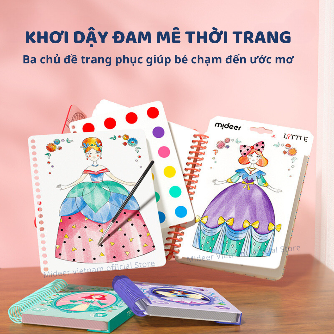 - Khởi Đầu Hành Trình Sáng Tạo Thật Dễ Dàng: Bé chỉ cần lấy cọ vẽ từ phía sau sách, nhúng nước và bắt đầu chọn màu yêu thích để tô lên trang phục, tạo nên những thiết kế độc đáo theo phong cách riêng.