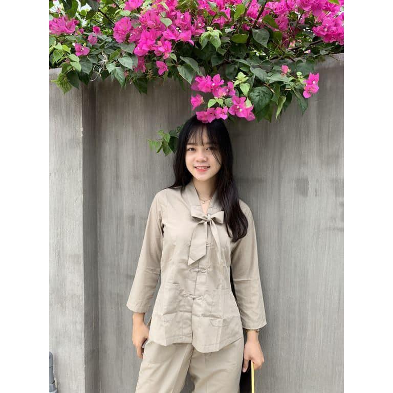 quần áo Phật tử cổ tàu cài chéo - đồ lam đi chùa Sen Hồng - set Phật tử nữ đẹp 0898553583