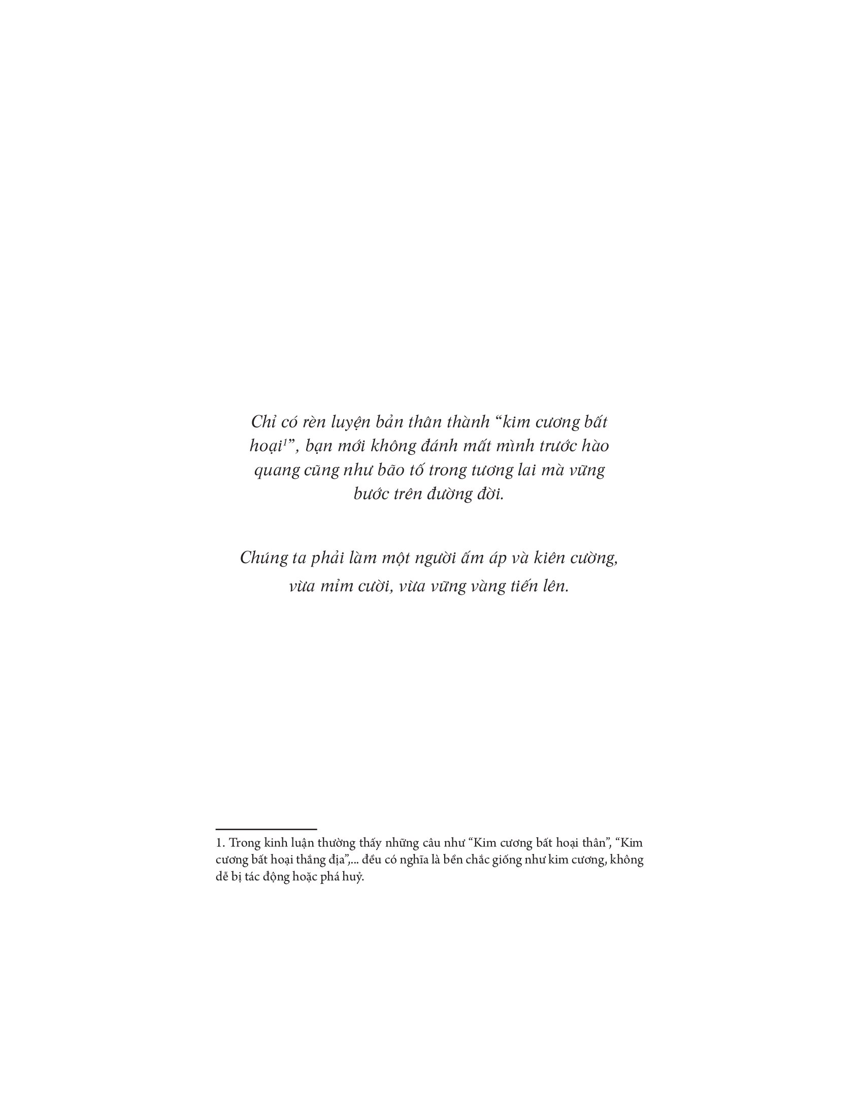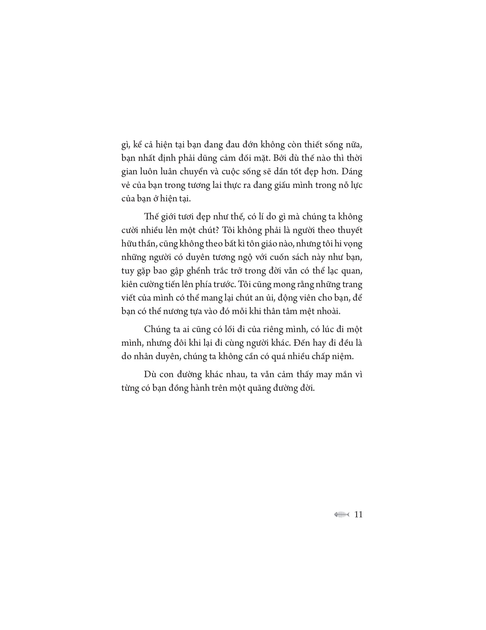 "Thế giới tươi đẹp như thế, có lí do gì mà chúng ta không cười nhiều lên một chút? Tôi không phải là người theo thuyết hữu thần, cũng không theo bất kì tôn giáo nào, nhưng tôi hi vọng những người có duyên tương ngộ với cuốn sách này như bạn, tuy gặp bao gập ghềnh trắc trở trong đời vẫn có thể lạc quan, kiên cường tiến lên phía trước. Tôi cũng mong rằng những trang viết của mình có thể mang lại chút an ủi, động viên bạn, để bạn có thể nương tựa vào đó mỗi khi thân tâm mệt nhoài."
