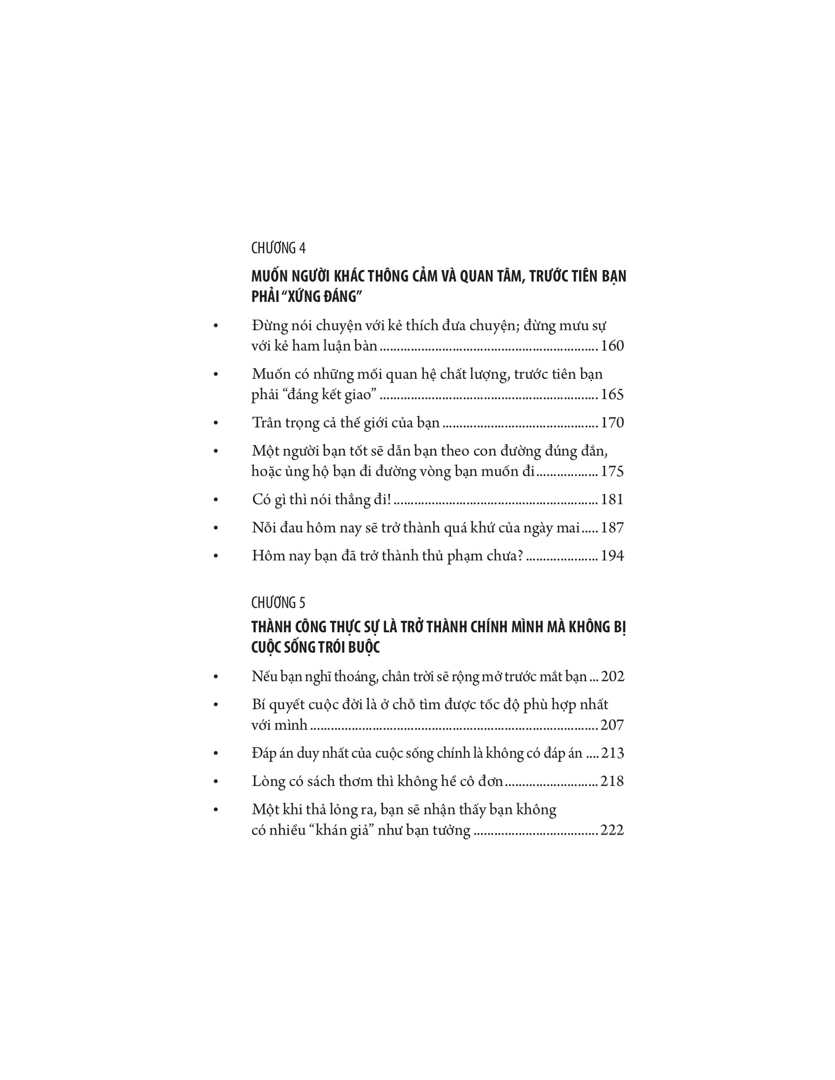 Chúng ta thường có xu hướng bỗng dưng theo đuổi một số thứ, rồi lại bất ngờ từ bỏ một số thứ. Chúng ta không đủ thấu hiểu bản thân và dễ bị cuốn theo số đông như một thói quen. Có lẽ đây chính là căn nguyên của mọi phiền não. Kinh nghiệm dành cho bạn là: Nhảy ra khỏi mục tiêu bạn muốn theo đuổi và nhìn rõ vị trí thực sự của nó trong thế giới này. Chỉ có như vậy, bạn mới không bị cuốn theo bất cứ ai hay sự vật nào, không vì có được mà vui quên trời đất, cũng không vì mất đi mà đau khổ đến tột cùng.