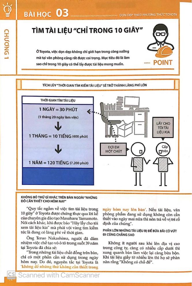 Phương thức sản xuất Toyota được tượng trưng bởi những khái niệm như Just In Time, Kanban, Kaizen. Phương thức này đã quá nổi tiếng khi chúng ta nhắc tới cái tên Toyota. Ở đâu đó vẫn có những suy nghĩ như “văn phòng của chúng tôi không thể bắt chước cách làm nơi công xưởng của Toyota được” hay “một số cá nhân có áp dụng đi chăng nữa thì cũng chẳng có ý nghĩa gì trong tổ chức”. Những suy nghĩ này là những điều ngộ nhận. Just In Time hay Kanban đúng là không phải cách làm mà ai cũng có thể bắt chước ngay được, nhưng dọn dẹp thì dù công ty nhỏ tới mấy, dù bạn làm việc gì đi chăng nữa thì đều có thể áp dụng ngay lập tức. Dọn dẹp theo phương thức Toyota không cần tới một hệ thống lớn, cũng không cần tiêu tốn nhiều kinh phí.