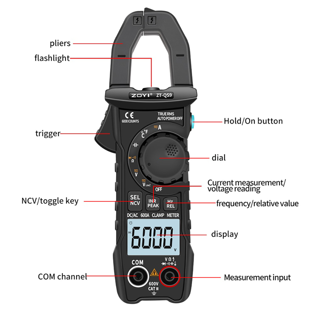 Đồng hồ Zoyi ZT-QS9 đo điện vạn năng TRMS 6000 số đếm, bộ kẹp khởi động kỹ thuật số, đo dòng điện AC/DC, đo chống nhiễu trở kháng, tính liên tục NCV, lưu giữ dữ liệu, đo RMS thực