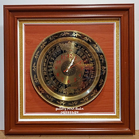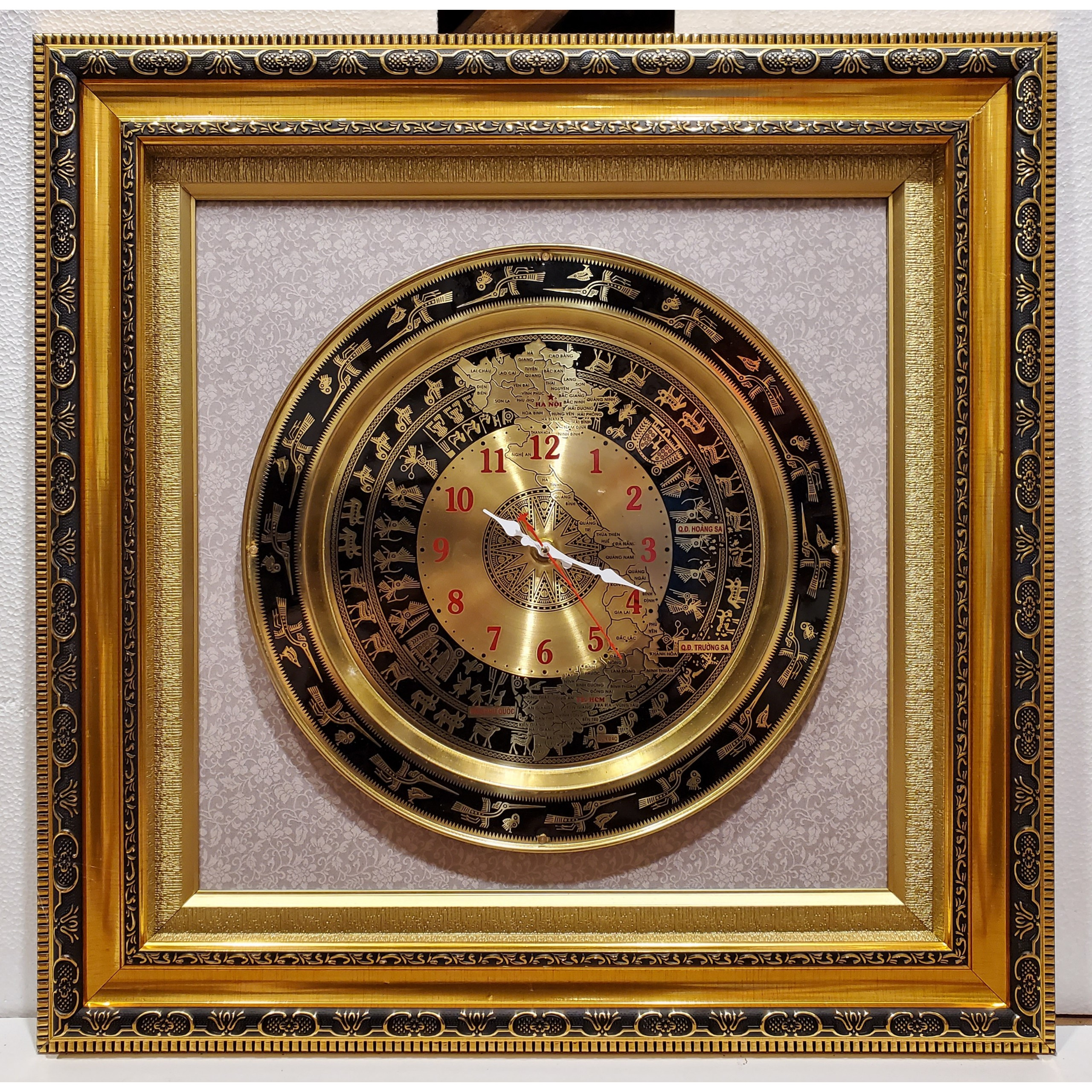 Đồng hồ mâm mặt trống đồng đông sơn Chất liệu đồng vàng nguyên chất 100% tạo hoa văn bằng công nghệ hóa chất ăn mòn rất tinh xảo. Khung tranh viền vàng composite chống mối mọt, mặt tranh lồng kính hoặc mika , máy đồng hồ Đài Loan Kích thước phủ khung 8585cm và 6868cm