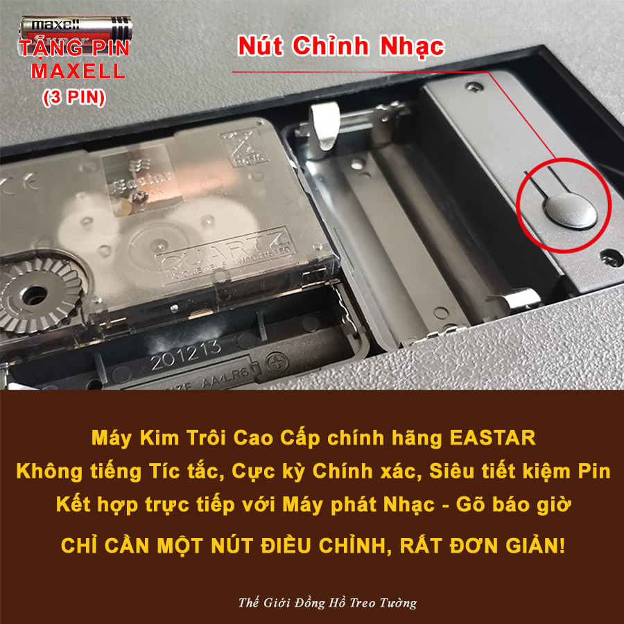 Đồng Hồ NHẠC CHUÔNG 16 Điệu NHẠC GÕ Báo Giờ - Máy Kim Trôi EASTAR Nhật – Mặt Số Hoa Văn Nổi 3D