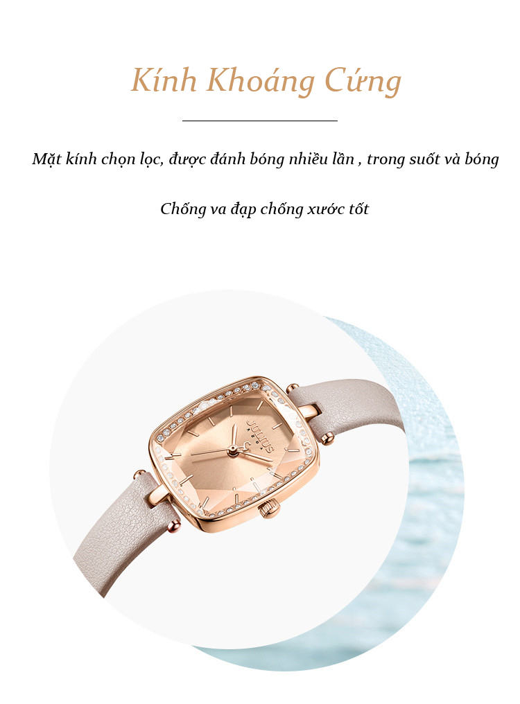 Mua tại TiktokTHÔNG SỐ SẢN PHẨM Thương hiệu: JULIUS Mã sản phẩm: JA-1341B Dành cho: Nữ giới, yêu thích thời trang tinh tế nhẹ nhàng Chất liệu dây: Dây Da Chất liệu mặt kính: Mặt kính khoáng Đường kính mặt: 22mmx26mm Độ dày: 0.8cm 8mm (Size dây) Độ rộng của dây: 10mm Chất liệu vỏ máy: Vỏ hợp kim không gỉ mạ ion vàng hồng, sử dụng công nghệ mạ IP chân không tiên tiến giúp đem lại độ sáng bóng và bền màu Máy: Quartz Nhật MIYOTA 2035 Khả năng chịu nước: Chống thấm nước 3ATM (30m) có thể đi mưa, rửa tay, rửa mặt. Tránh tiếp xúc với môi trường hóa chất như giặt đồ, tấm gội. Bảo Quản: Lau chùi vệ sinh sản phẩm thường xuyên bằng giấy mền khỏi mồ hôi cơ thể và hạn chế tiếp xúc hóa chất bảo vệ màu sắc sản phẩm và pin sản phẩm lâu dài.