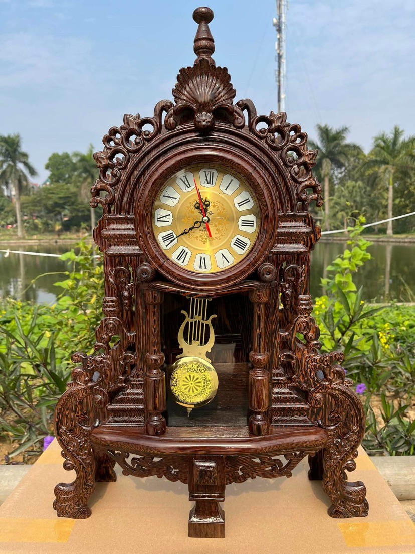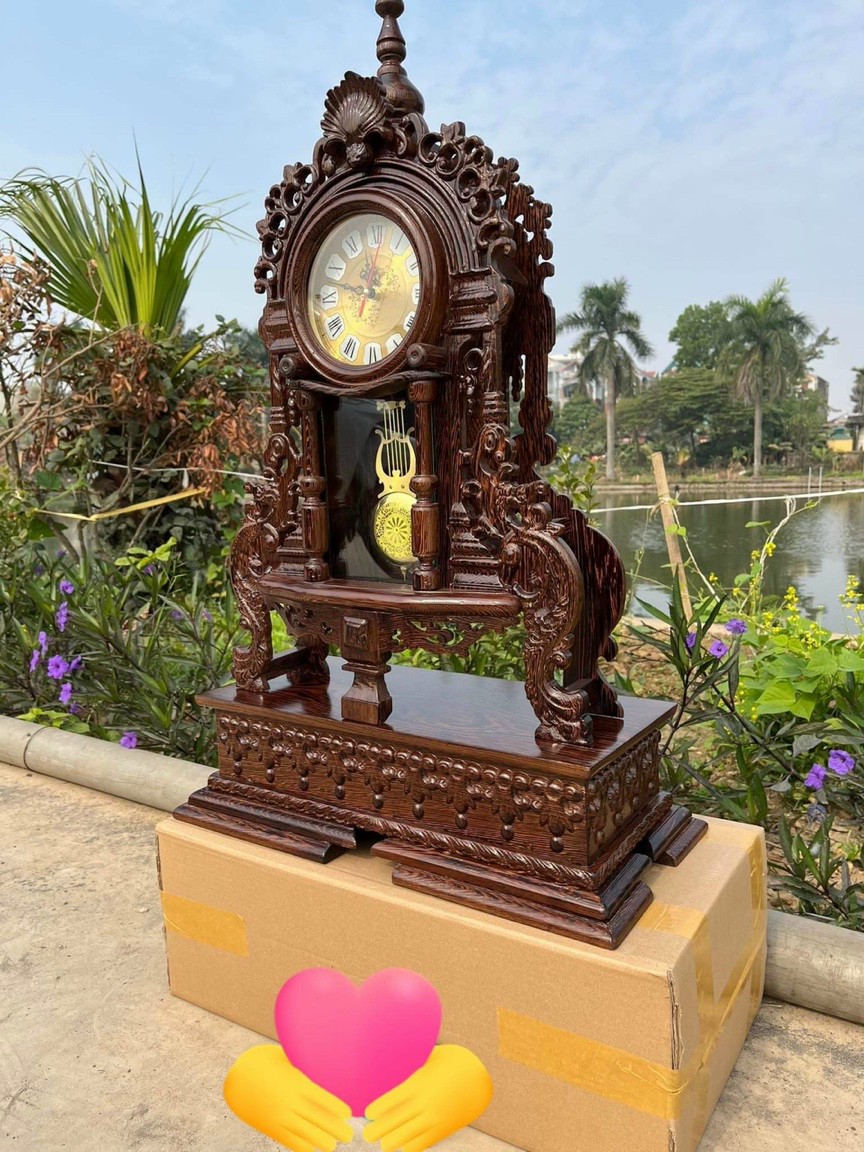 ✨Đồng hồ quả lắc để bàn tân cổ điển bằng gỗ mun đuôi công kt cao 70×45×15cm + chân đế cao 15×52×29cm