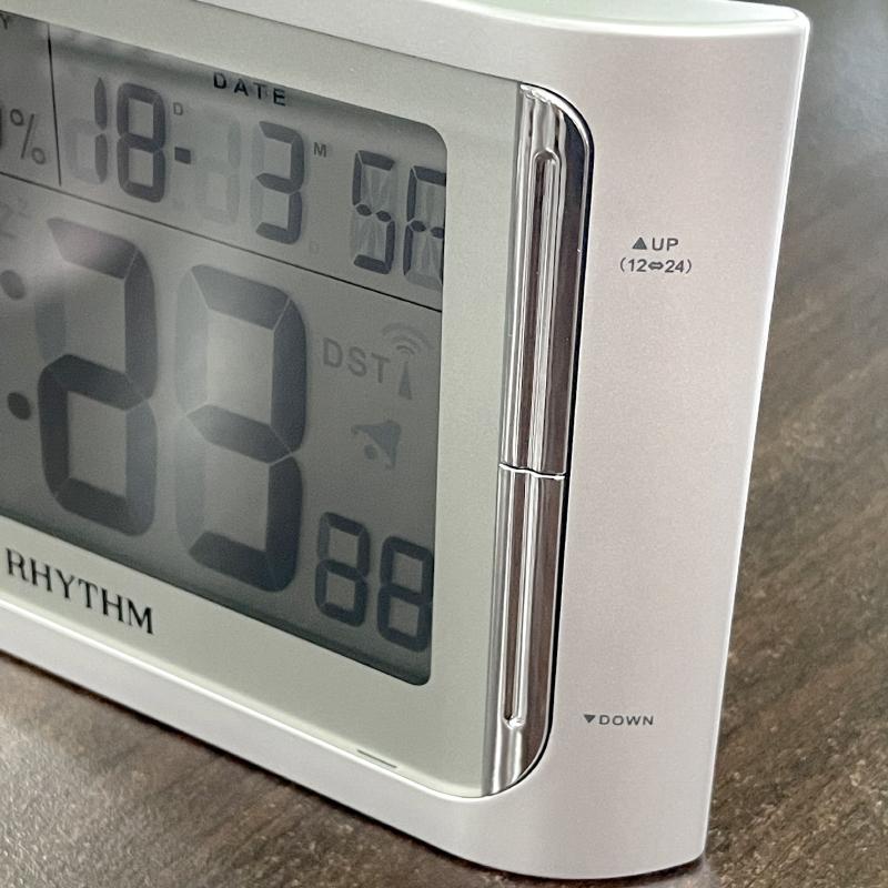 Đồng hồ điện tử Rhythm LCT084NR19, sử dụng 3 pin AA. Vỏ nhựa cao cấp sơn nhũ bạc, kích thước 22.4 x 15.0 x 1,8cm nặng 320g. Màn hình điện tử hiển thị lịch ngày