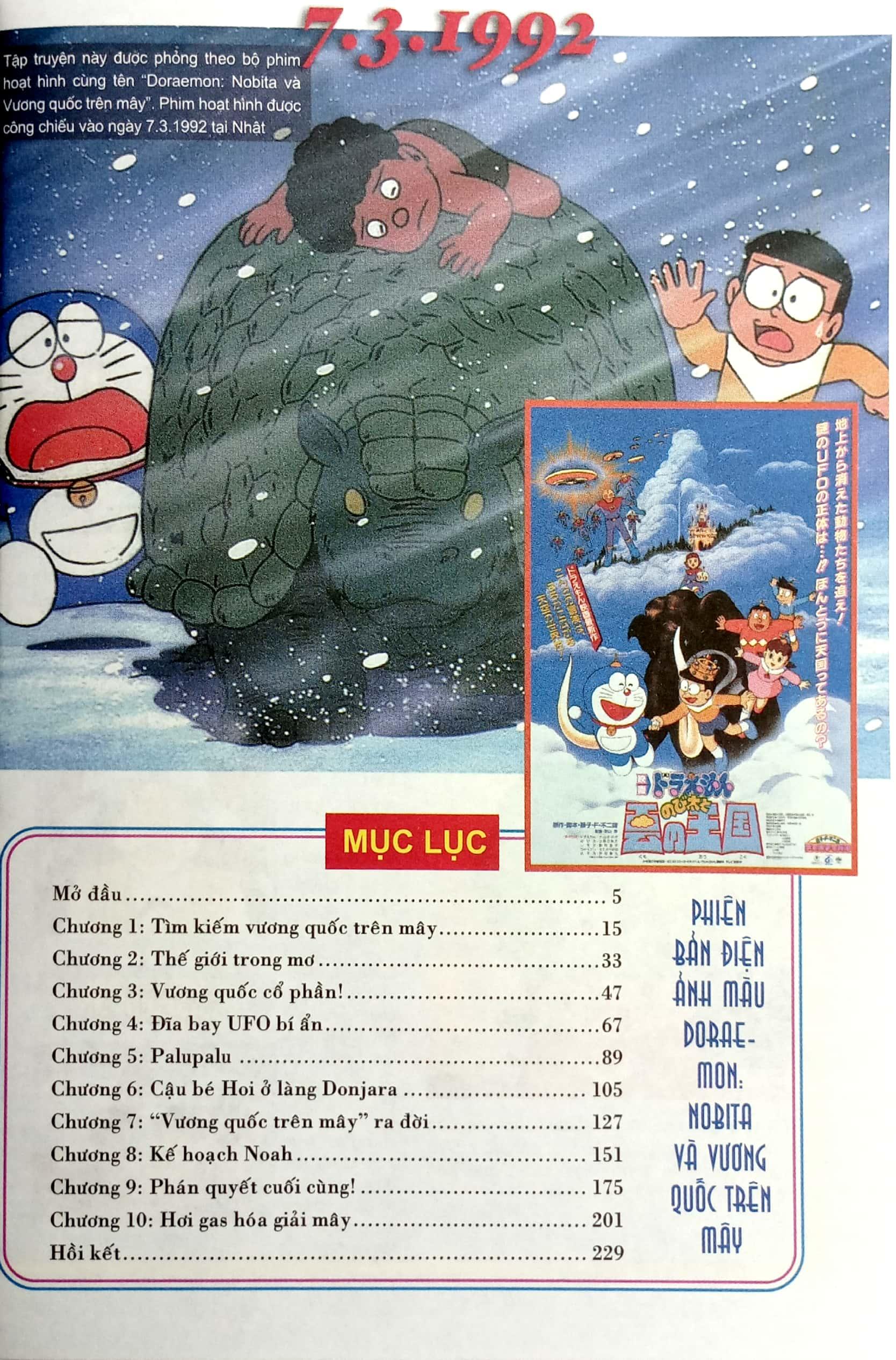 Mua tại TiktokDoraemon - Phiên Bản Điện Ảnh Màu - Ấn Bản Đầy Đủ Tập 13 - Nobita Và Vương Quốc Trên Mây Nobita và vương quốc trên mây là tác phẩm thứ 13 trong loạt phim hoạt hình Doraemon rất được yêu thích, chuyển thể từ nguyên tác truyện tranh cùng tên của tác giả FUJIKO F FUJIO. (bộ phim được công chiếu vào mùa xuân năm 1992). Doraemon cùng với nhóm bạn Nobita đã xậy dựng một vương quốc trong mơ trên những đám mây. Nhưng không ngờ, nhóm bạn lại bị lạc vào Thiên Quốc, nơi mà những loài động vật tưởng như đã tuyệt chủng trên mặt đất đang sinh sống một cách hạnh phúc… Và còn cả những con người nơi Thiên Quốc ấy nữa, họ đến từ đâu…? Chúng ta hãy bước vào vương quốc bồng bềnh trên những đám mây cùng với những người bạn nhé!