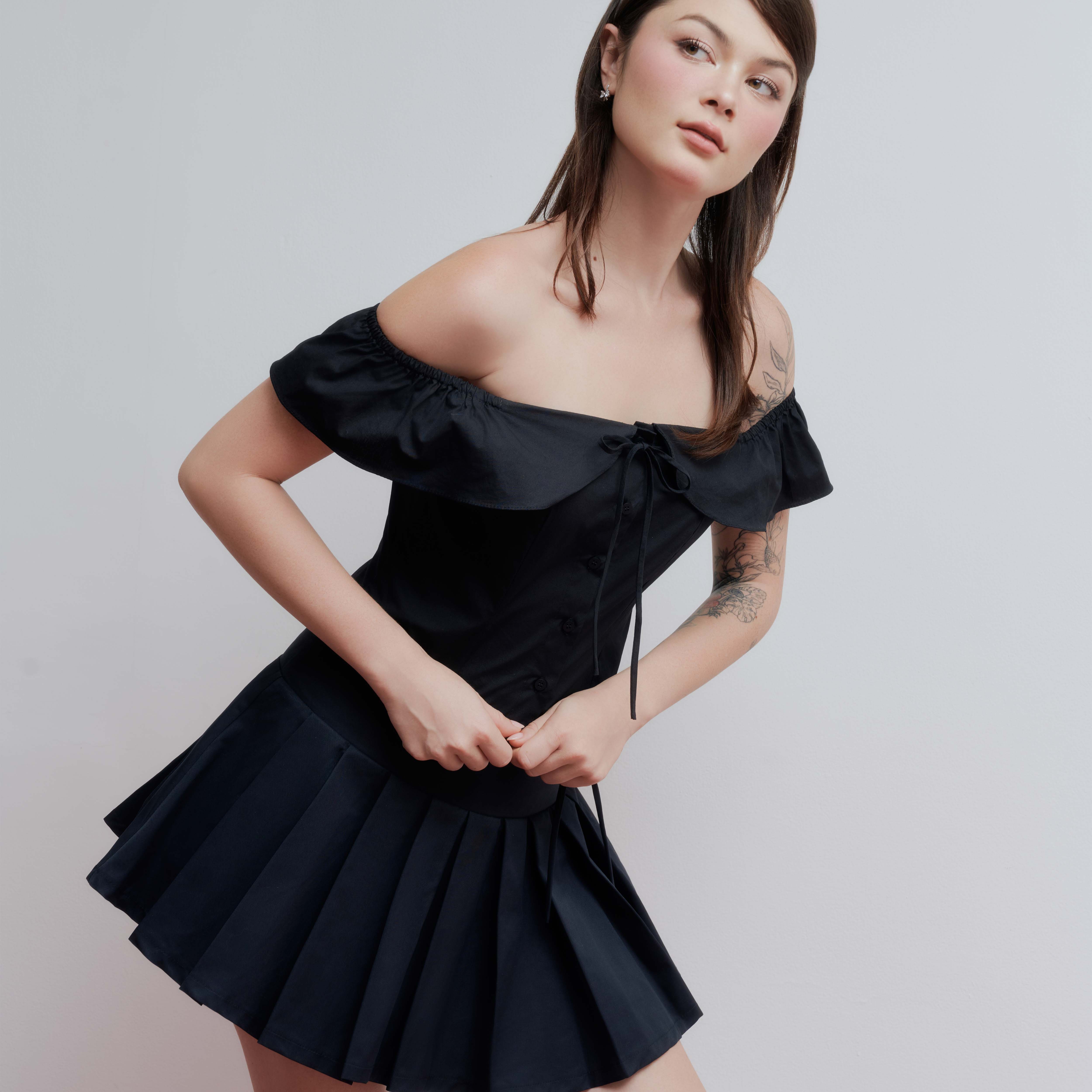 Váy đen nhún La Mộc với chất liệu xoa lụa Korea tạo cảm giác mềm mại. Thiết kế nhún phần hông trước và sau góp phần tôn dáng của nàng. Thiết kế dành riêng cho