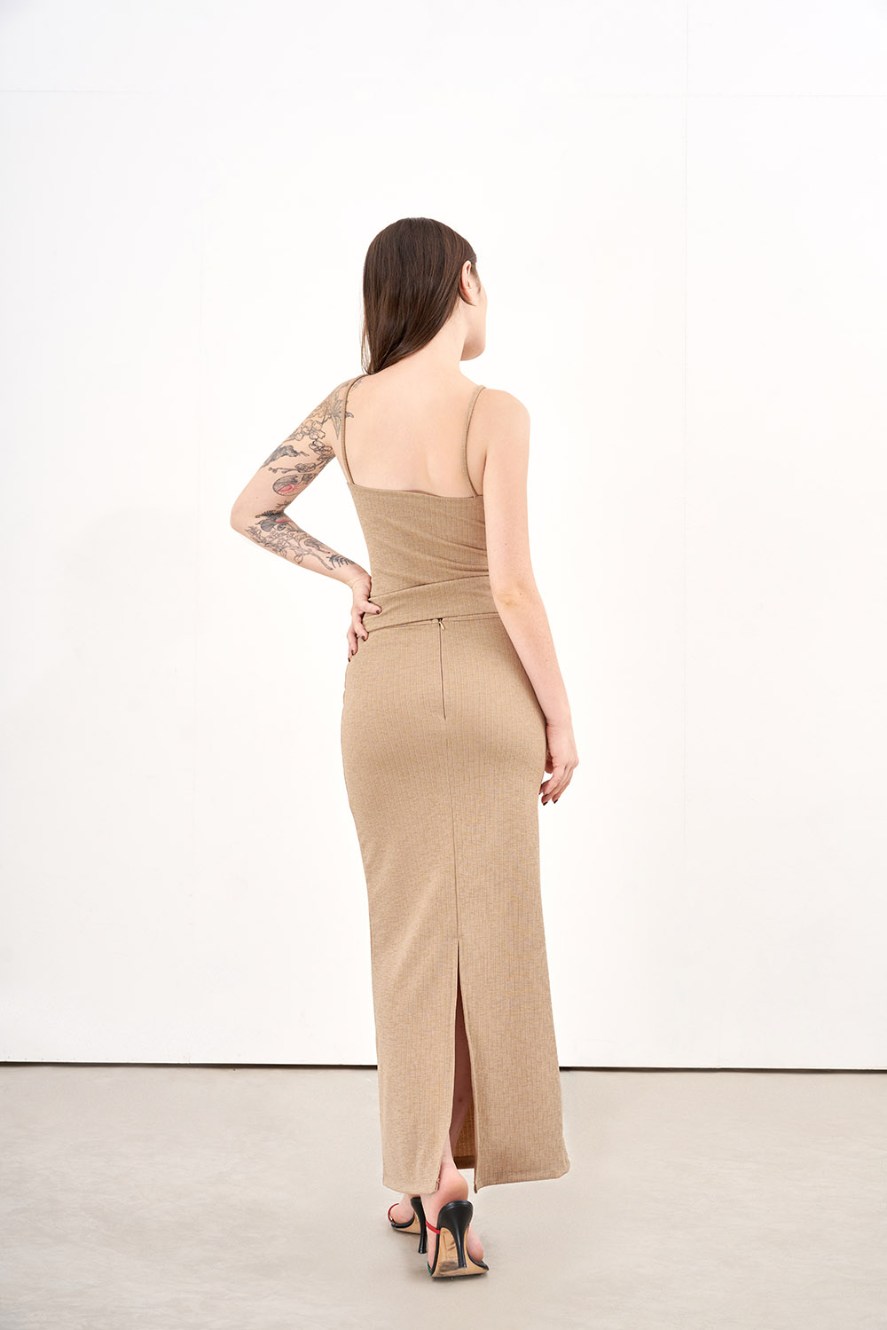 1. Mô tả INFINITY / KELSEY Chân váy bút chì, dài qua mắt cá, xẻ lượn. 2. Thông tin chi tiết Dòng hàng: Chân váy Chất liệu: Modal Màu sắc: Đen/Nâu đỏ Model: 1m73, 50kg,