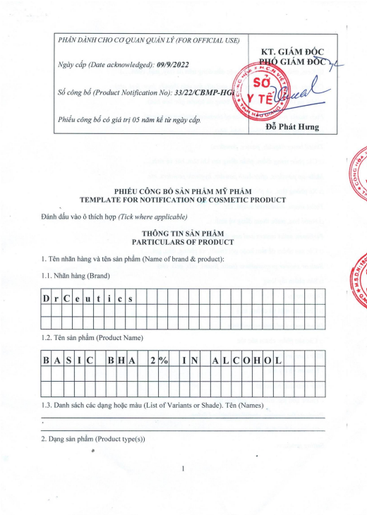 Dung dịch DrCeutics Basic BHA 2% In Alcohol Thành phần: Acid salicylic: giúp làm bong tế bào da, tiêu sừng, thông thoáng và giảm kích thước lỗ chân lông, chống viêm, kháng khuẩn, kháng nấm,