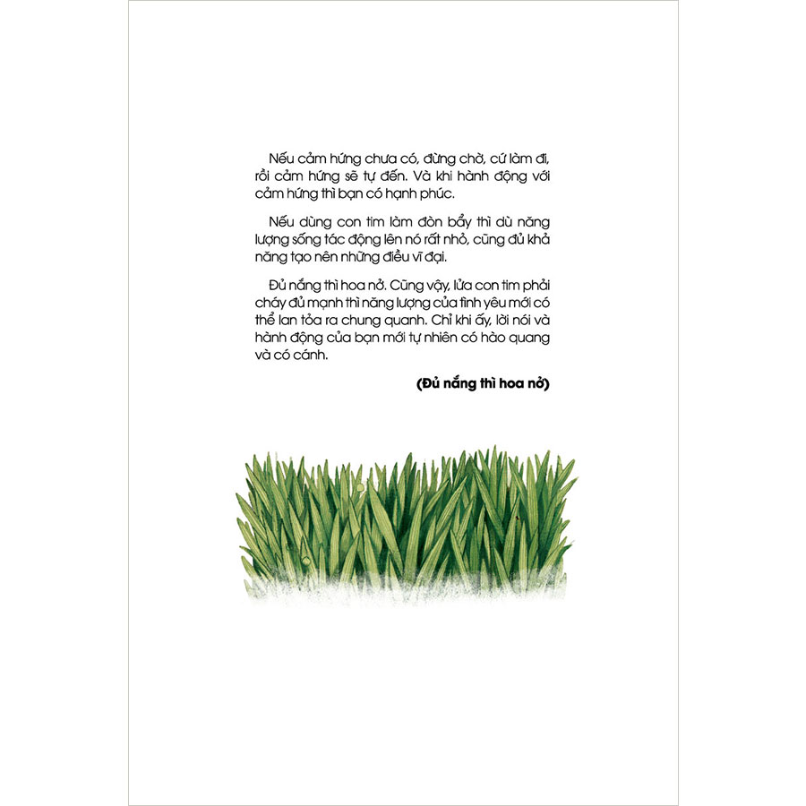 Đủ nắng thì hoa nở. Cũng vậy, lửa con tim phải cháy đủ mạnh thì năng lượng của tình yêu mới có thể lan tỏa ra chung quanh. Chỉ khi ấy, lời nói và hành động của bạn mới tự nhiên có hào quang và có cánh.
