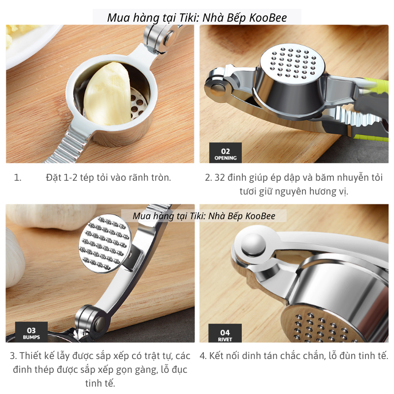 • Dụng cụ nghiền tỏi bán tại Nhà bếp KOOBEE chất liệu thép không gỉ, chống ăn mòn cao cấp, đảm bảo an toàn vệ sinh thực phẩm khi tiếp xúc với đồ ăn.
