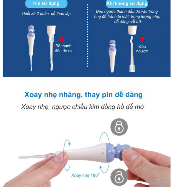 - Trang bị đèn led với ánh sáng dịu nhẹ, giúp mẹ nhìn rõ bụi bẩn trong tai, bảo vệ ống tai khỏi tổn thương khi không nhìn rõ. - Thiết kế nhỏ gọn, tiện