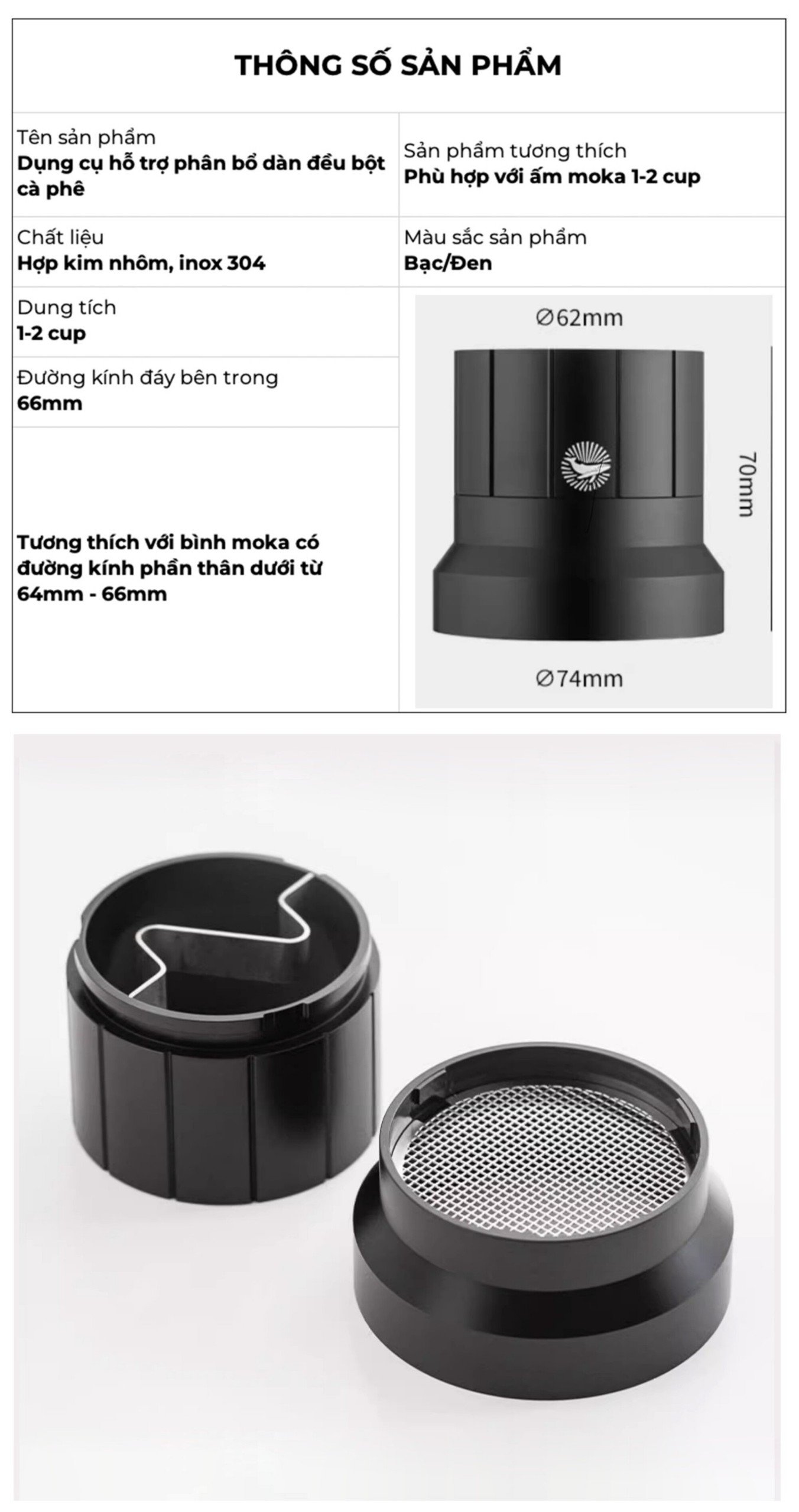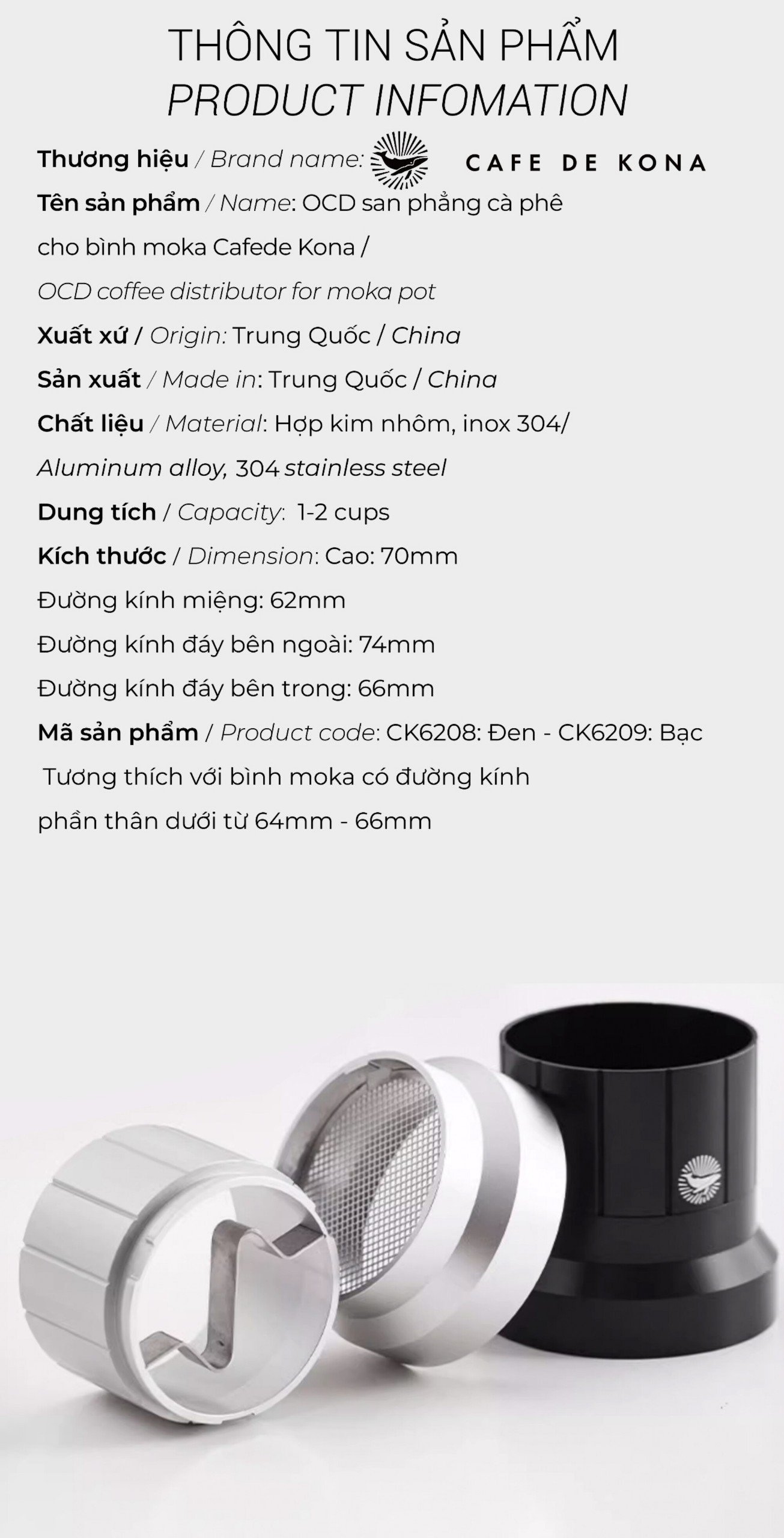 OCD SAN PHẲNG CÀ PHÊ CHO BÌNH MOKA 2 CUP CAFEDE KONA Vòng đong cà phê pha Moka được thiết kế với hai chức năng chính: Ngăn bột cà phê không bị đổ ra ngoài trong quá trình đong cà phê vào phễu đựng Moka. Phân bố bột cà phê đều khắp giỏ lọc. Sản phẩm được làm từ inox 304/hợp kim nhôm . Bạn có thể vệ sinh dễ dàng bằng nước hoặc chổi vệ sinh. Lưu ý: Sản phẩm chỉ tương thích với bình moka có đường kính phần thân dưới từ 64mm-66mm