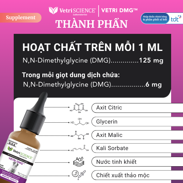 Sản phẩm Vetri DMG chứa thành phần chủ đạo là N,N-Dimethylglycine đóng vai trò như một adaptogen, mang lại hơn 40 lợi ích cho sức khỏe, đặc biệt giúp tăng cường miễn dịch và sức bền của thú cưng.