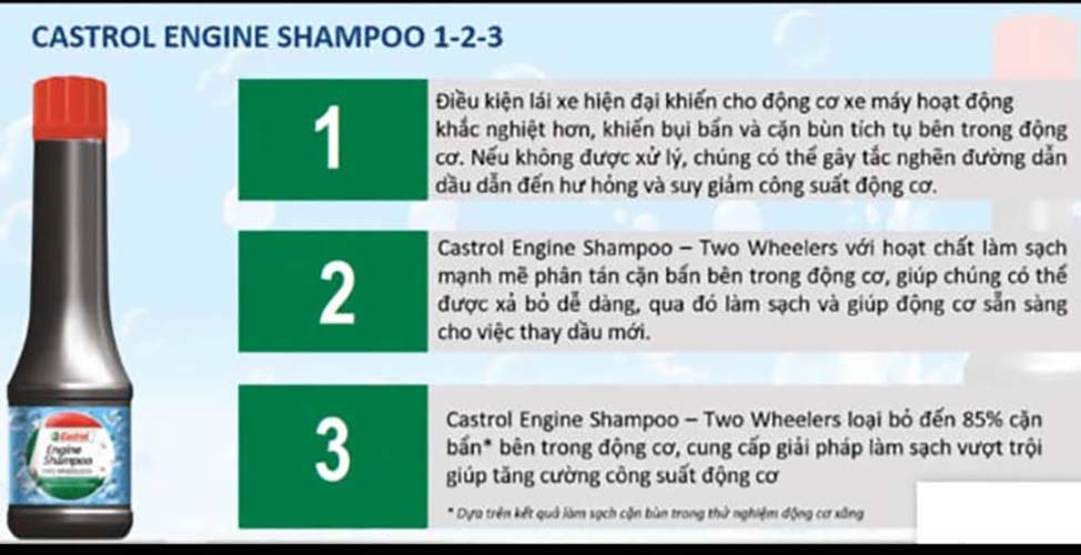 Điều kiện lái xe hiện đại khiến động cơ xe máy làm việc khắc nghiệt hơn, hình thành bụi bẩn và cặn bùn tích tụ bên trong động cơ. Nếu không được loại bỏ hoàn toàn khi thay dầu động cơ, các cặn bẩn này gây ảnh hưởng trực tiếp đến hoạt động của động cơ. Castrol Engine Shampoo - Two Wheelers là giải pháp súc rửa động cơ trước khi thay dầu, loại bỏ đến 85% cặn bẩn* bên trong động cơ, giúp làm sạch động cơ hiệu quả. Lợi điểm Làm sạch vượt trội giúp tăng cường công suất động cơ. Hướng dẫn sử dụng: Chuẩn bị: