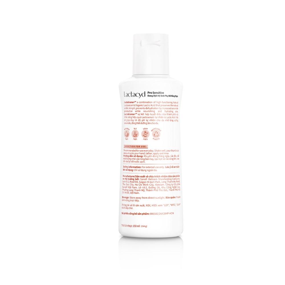 - Sản phẩm an toàn, không gây khô, thích hợp sử dụng hằng ngày. Đối tượng sử dụng: Dung Dịch Vệ Sinh Phụ Nữ Lactacyd Pro Sensitive 150ml phù hợp sử dụng cho da nhạy cảm. Hướng dẫn sử dụng: