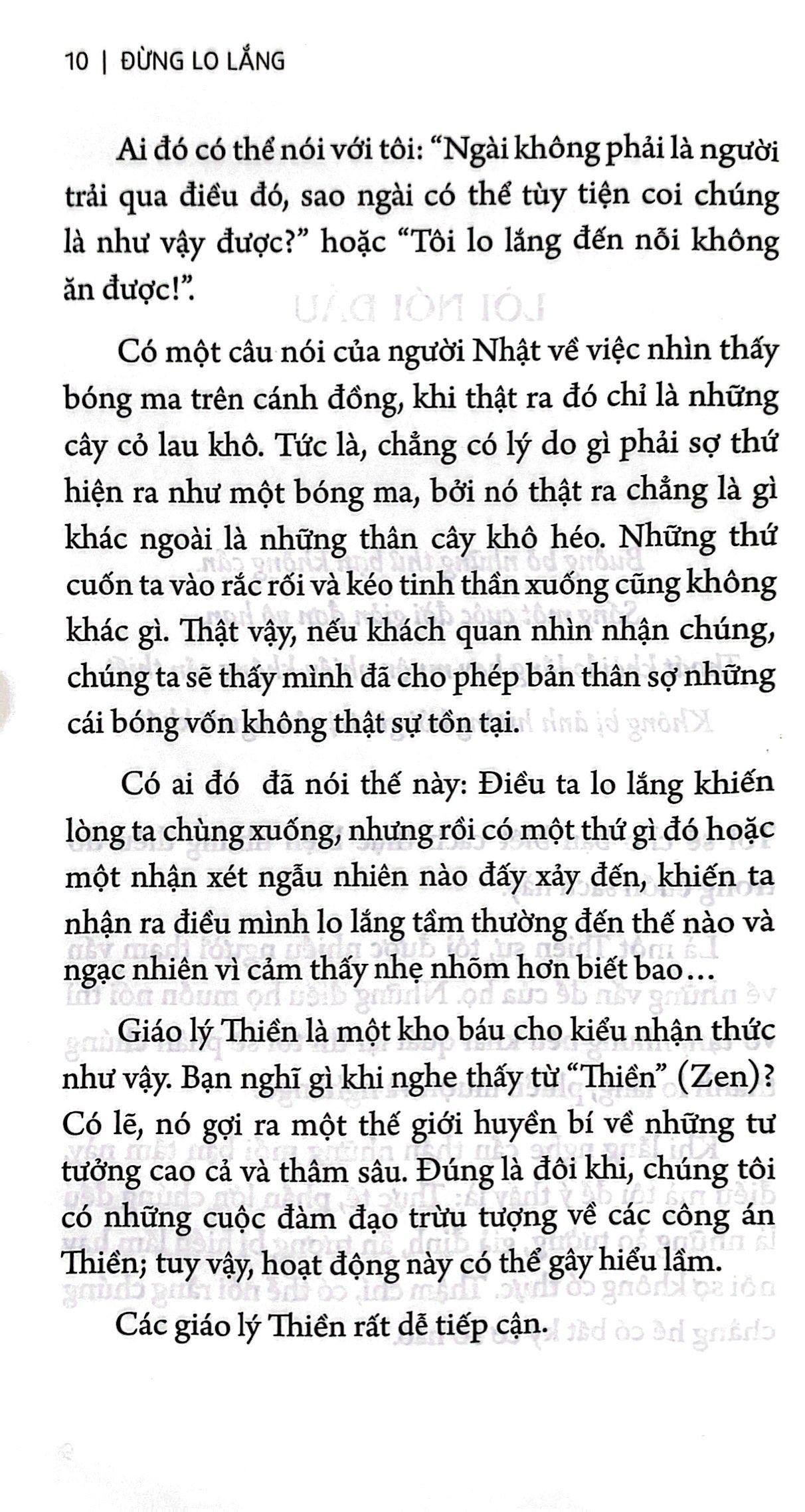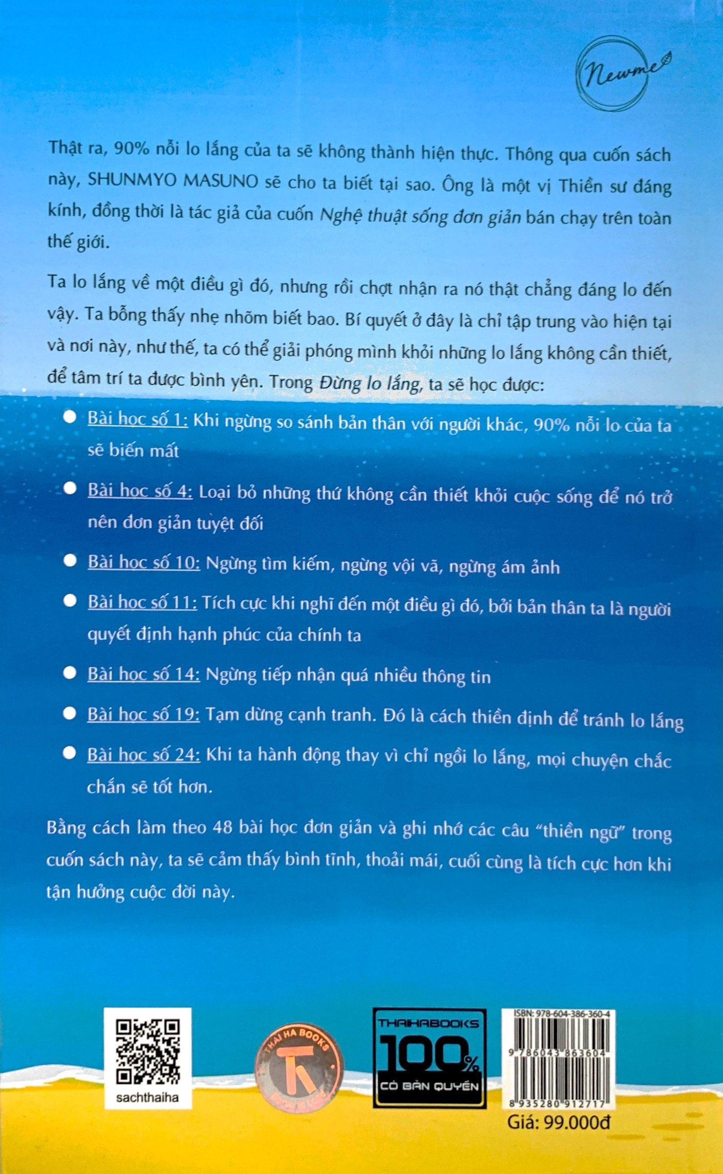 Ta lo lắng về một điều gì đó, nhưng rồi chợt nhận ra nó thật chẳng đáng lo đến vậy. Thật ra, 90% nỗi lo lắng của ta sẽ không thành hiện thực. Ta bỗng thấy nhẹ nhõm biết bao. Bí quyết ở đây là chỉ tập trung vào hiện tại và nơi này, như thế, ta có thể giải phóng m.ình khỏi những lo lắng không cần thiết, để tâm trí ta được bình yên. Thông qua cuốn sách này, SHUNMYO MASUNO sẽ cho ta biết tại sao.