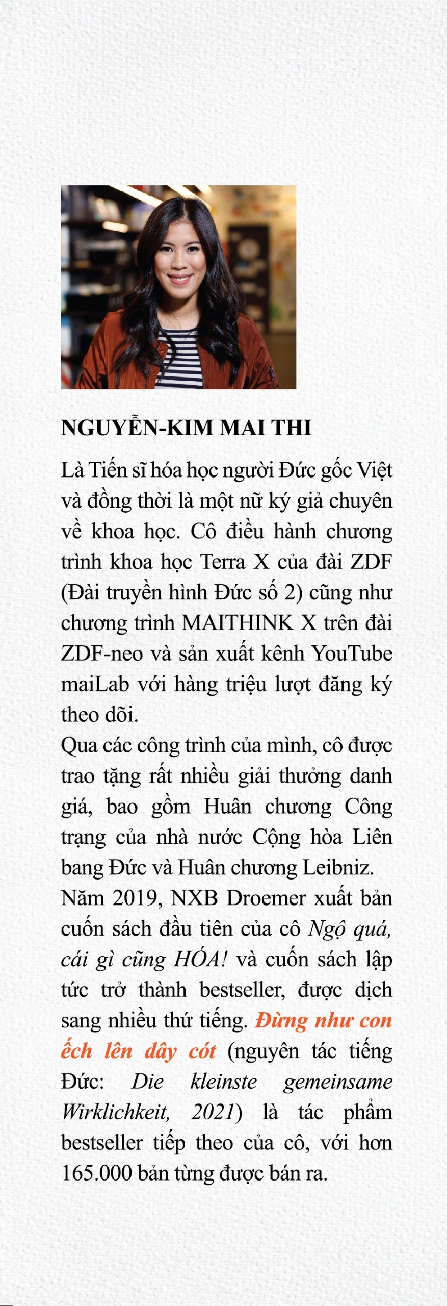 THÔNG TIN TÁC GIẢ Nguyễn-Kim Mai Thi Tác giả hiện là một nhà hóa học, nhà truyền thông khoa học, người dẫn chương trình truyền hình và Youtuber người Đức, các sản phẩm sách tiêu