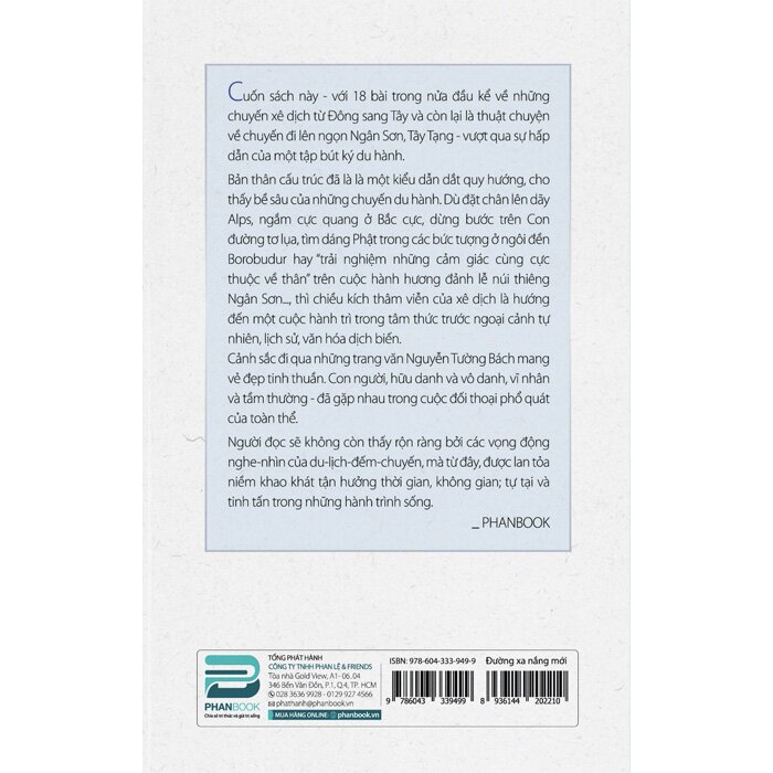 Đường xa nắng mới của Nguyễn Tường Bách không chỉ đưa độc giả phiêu lãng khắp nơi qua những chuyến du hành thú vị, mà còn chia sẻ với người đọc những trải nghiệm sâu sắc trên con đường ngao du thế giới bên ngoài để chứng nghiệm những đổi thay trong nội tâm. - Hơn phân nửa tập sách là bút ký ghi lại cuộc hành hương chiêm bái núi Kailash (Tây Tạng) ở độ cao trên 5.000m do tác giả và 21 người Việt Nam cùng tổ chức đi vào tháng 8-2011. Do vậy, tập bút ký vừa mang tính thời sự vừa ướp đậm những trải nghiệm tâm linh với nét nhìn tinh tế trong mỗi sự vật.