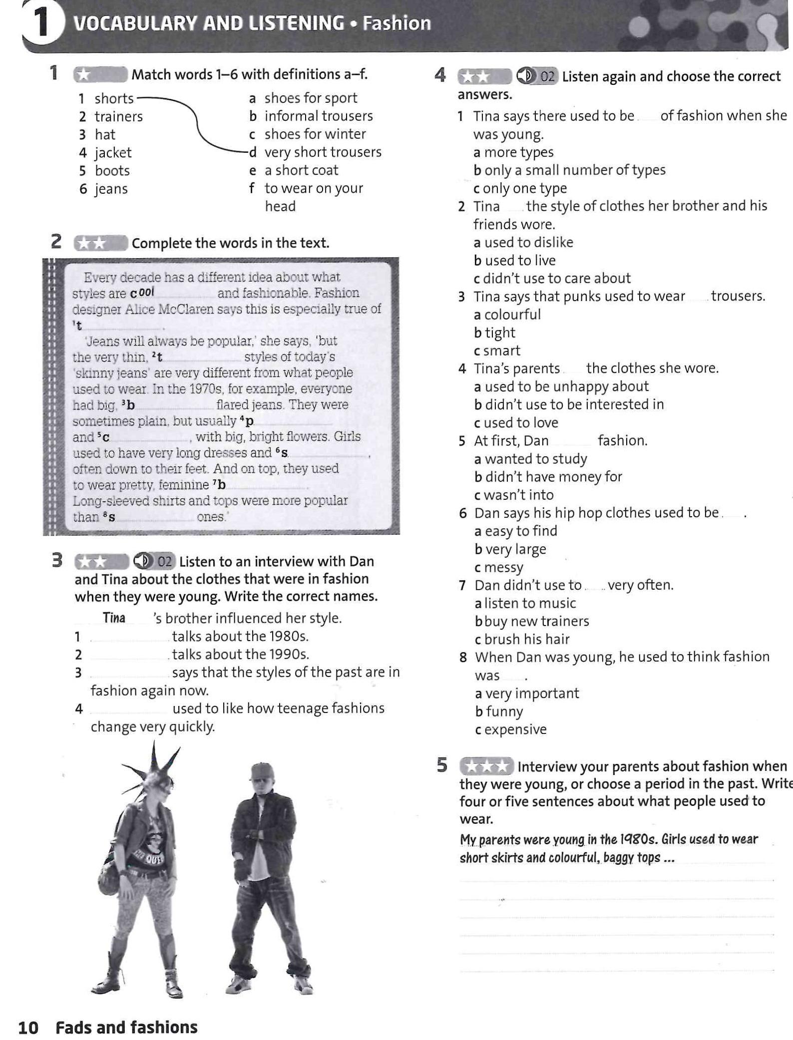 The Workbook includes exercises in grammar, vocabulary and skills, which mirror the language and skills work in the Student's Book pages. There are three levels of practice activities: one-star activities provide basic revision and language manipulation; two-star activities involve more productive exercises; and three-star activities are more open and offer more challenge. There is a two-page Progress review at the end of each unit. These exercises check understanding of all the vocabulary, grammar and skills presented in the unit. They also provide a record of what has been learned in the unit. The Self-evaluation section encourages students to think about their progress. This type of activity is also very helpful in students' development as learners because it encourages them to take responsibility for their own learning. There is a listening exercise in every Progress review. The audio for this is available on the online Practice Kit.