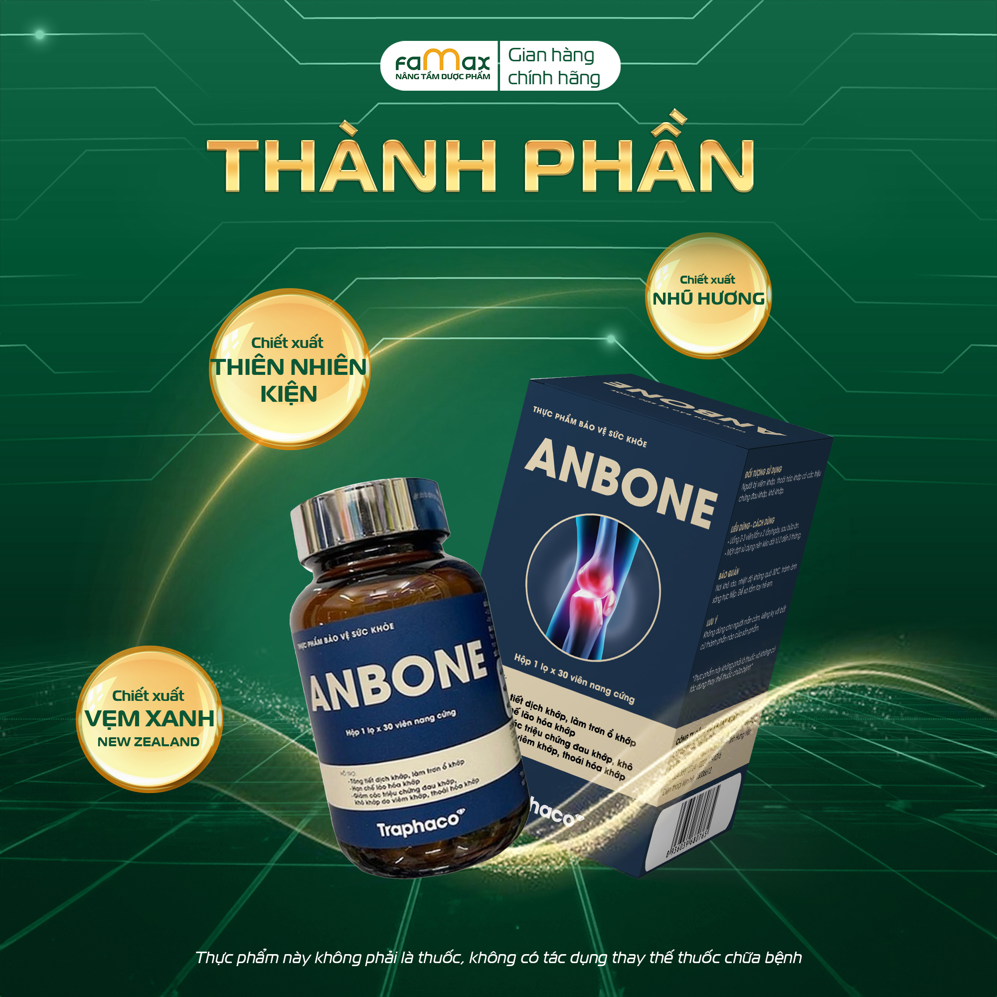 THỰC PHẨM BẢO VỆ SỨC KHỎE ANBONE Thành phần Trong mỗi viên nang cứng có chứa: – New Zealand Greenshell Mussel Extract…100 mg (Chiết xuất Vẹm xanh New Zealand) – Homalomena occulta Extract (Chiết xuất