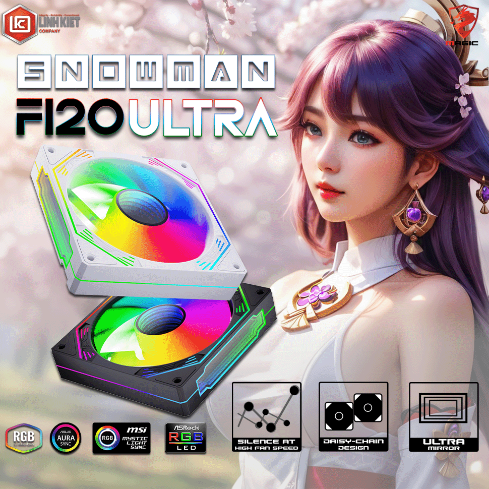 Thông tin sản phẩm: • Thương hiệu: Magic • Model: Fan Magic Snowman F130 ARGB / Fan Magic Snowman F130 ARGB REVERSE • Kích thước: 120 x 120 x 25 (mm) – Phù hợp cho