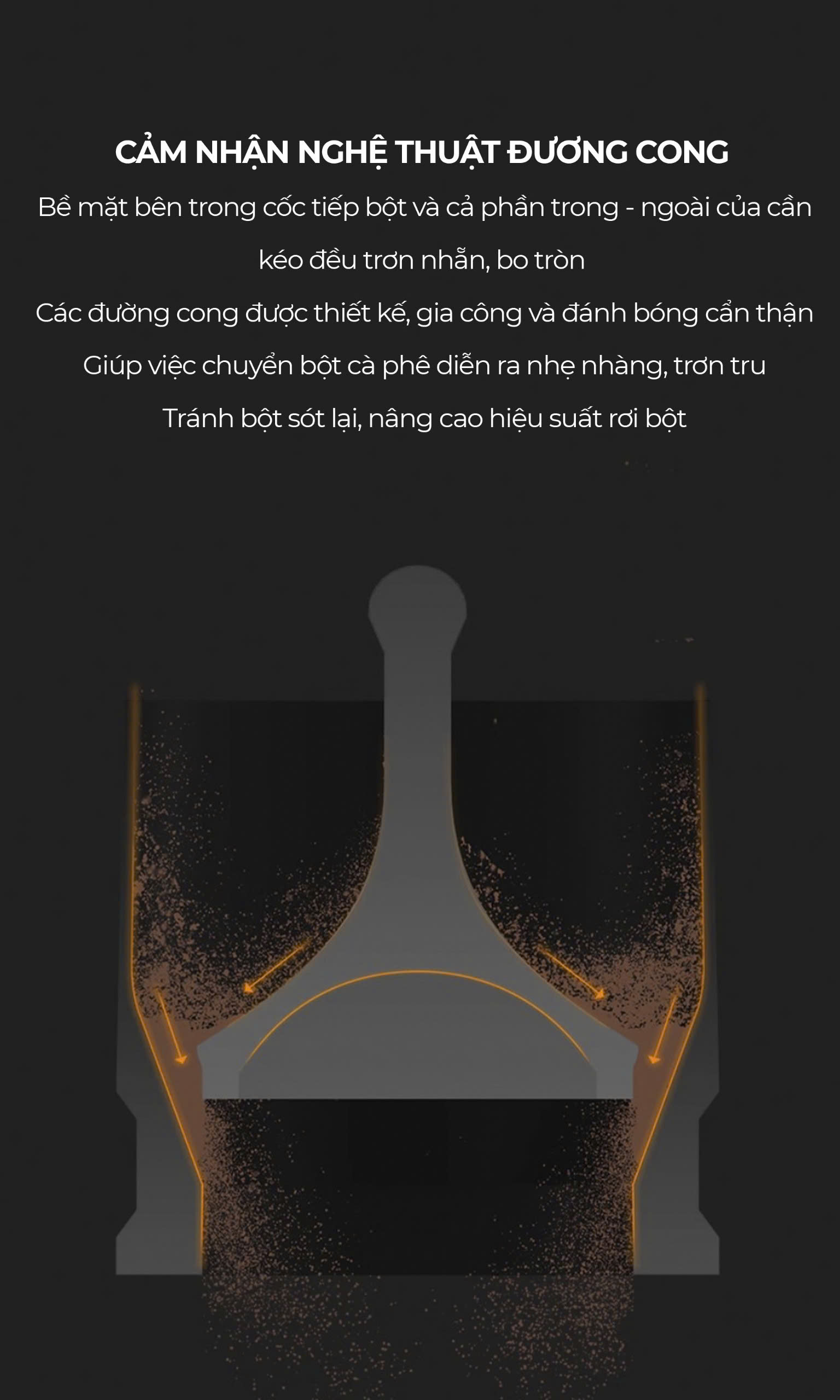 • Độ dốc tối ưu: Giúp bột cà phê chuyển nhanh và đều, phù hợp với tay cầm 58mm.