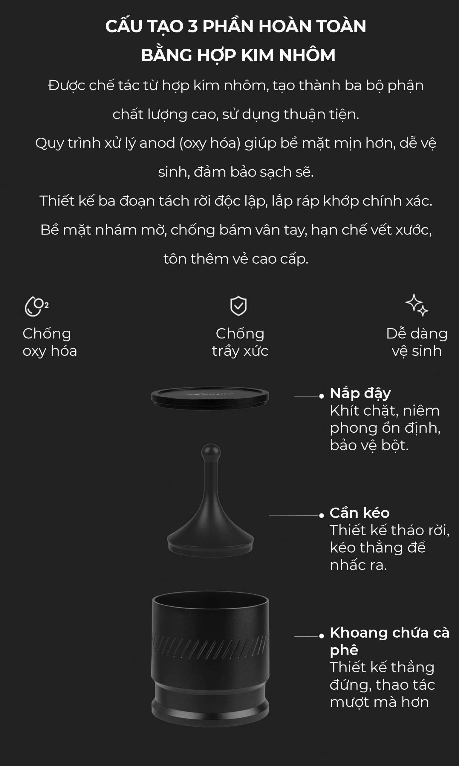 • Nắp đậy và thanh kéo thông minh: Kéo nhẹ để lấy bột, giữ bột không bị nhiễm bụi.