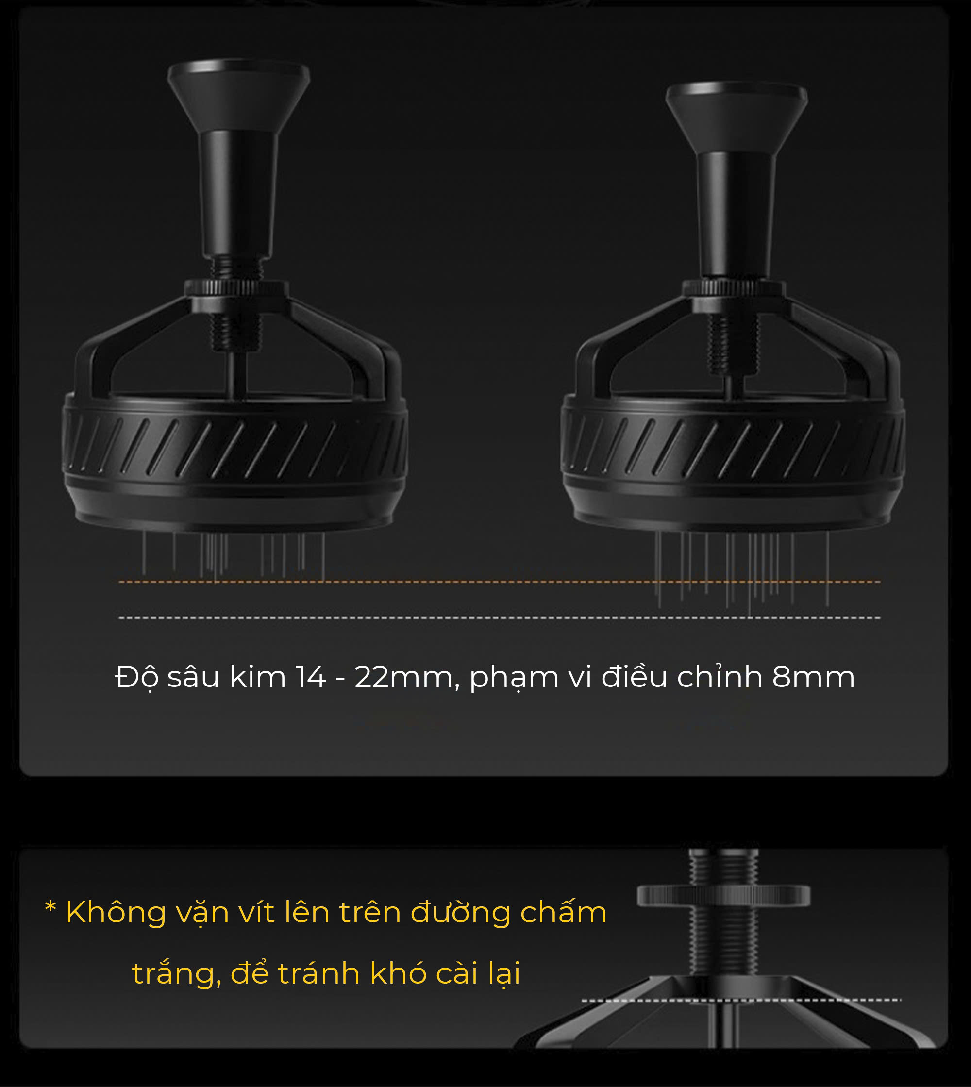 ️ Điều chỉnh độ sâu kim linh hoạt (18 - 22mm). Xoay ngược chiều kim đồng hồ để tăng độ sâu, xoay cùng chiều để giảm.