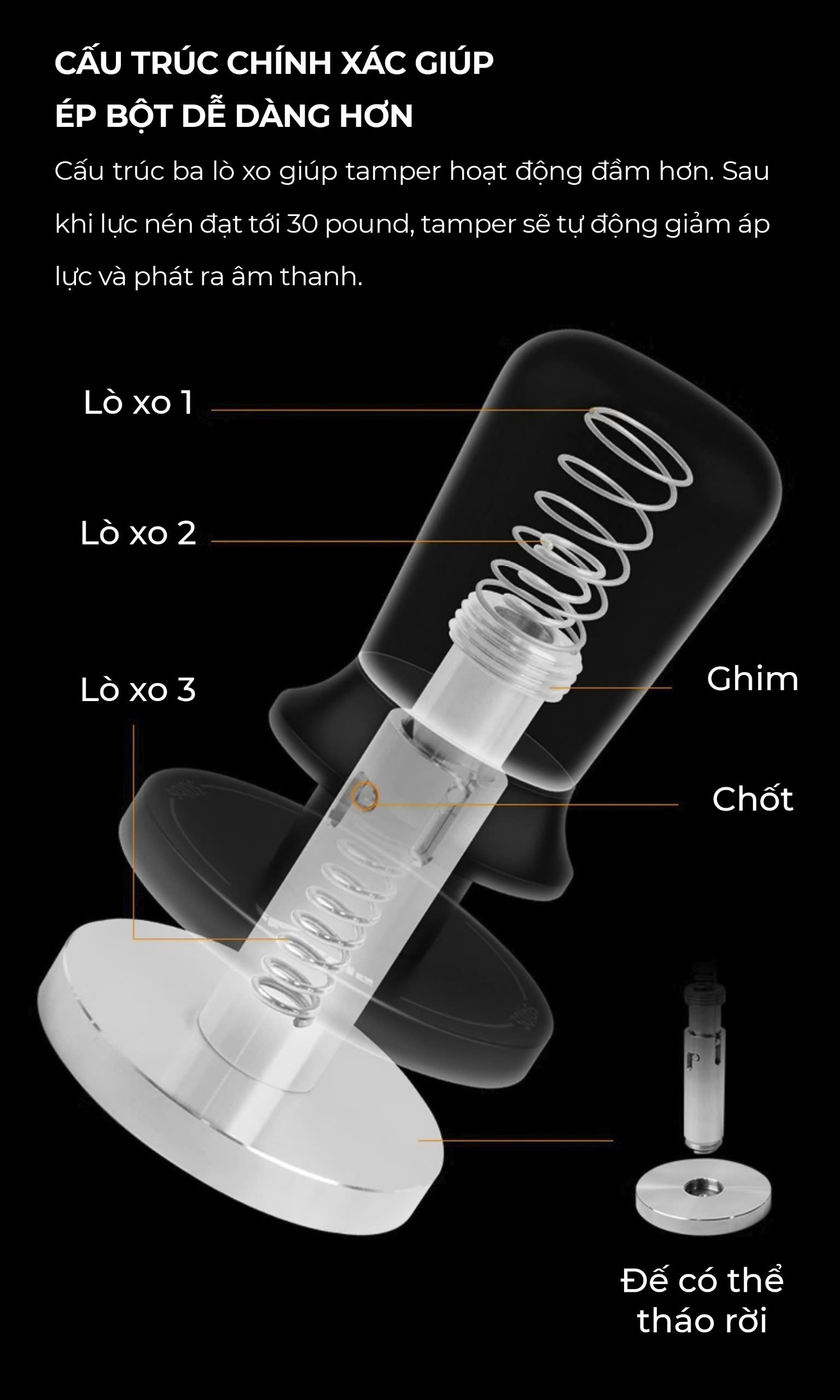 Lực nén cố định 30lbs – Giúp kiểm soát áp suất chính xác, hạn chế lỗi kênh nước, đảm bảo espresso đậm đà.