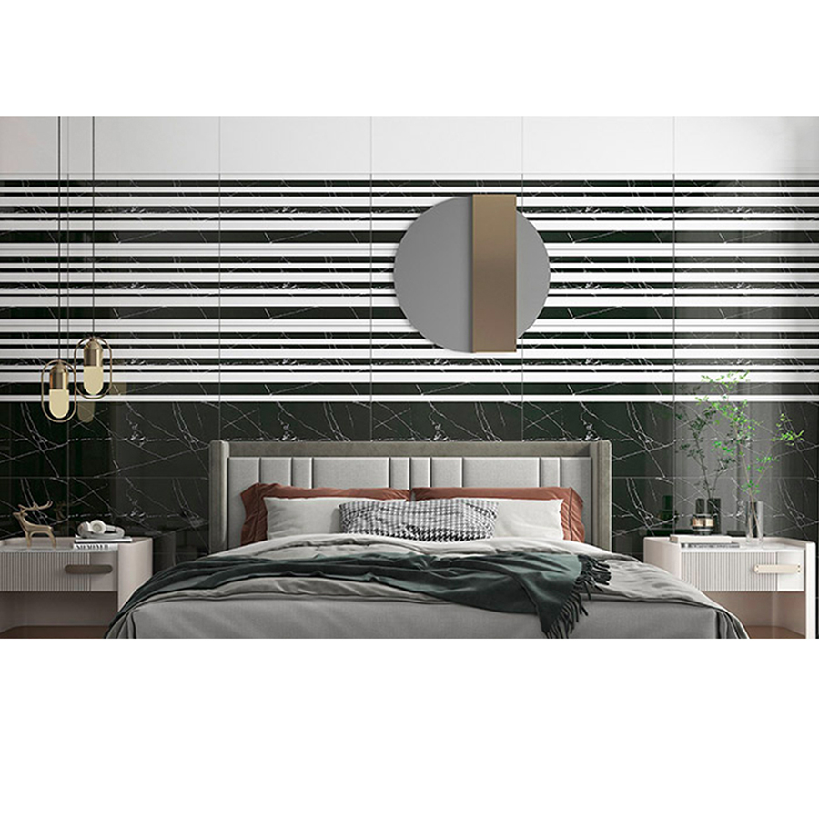- Nền gạch men ốp tường có sự kết hợp giữa hai gam màu trắng - đen nổi bật, vân đá trắng xuất hiện trên nền gạch đen nổi bật tạo nên vẻ đẹp độc đáo và hiện đại cho không gian sử dụng.