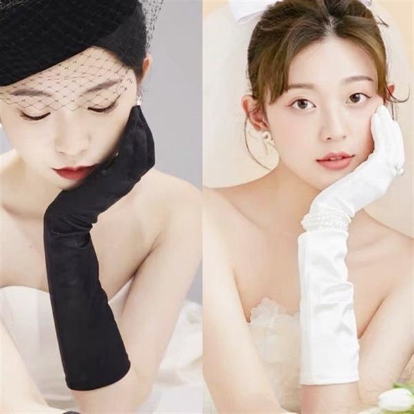 Găng tay Cô dâu và Dạ hội, đi tiệc, sự kiện, lễ hội, chụp ảnh. MS: 44365 Chất liệu: cotton lụa. Kiểu dáng: bao kín ngón, ôm tay. Đặc điểm: dáng dài, co giãn và